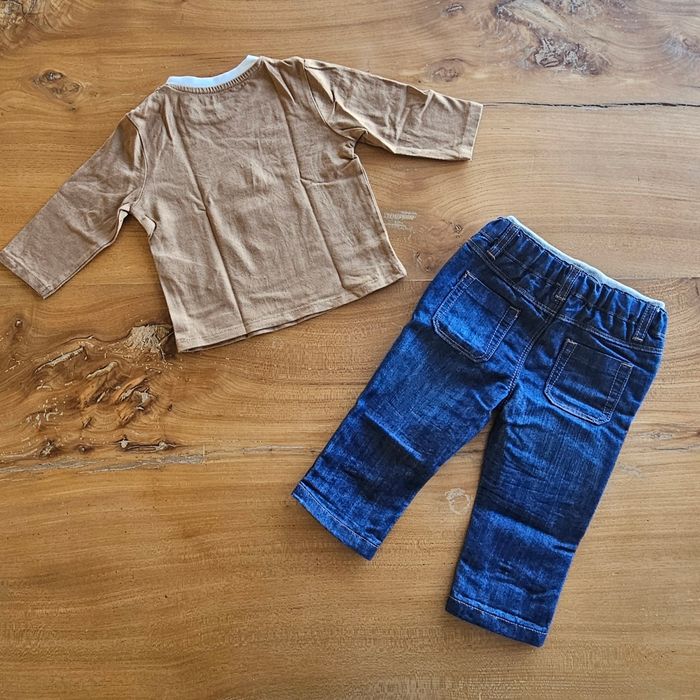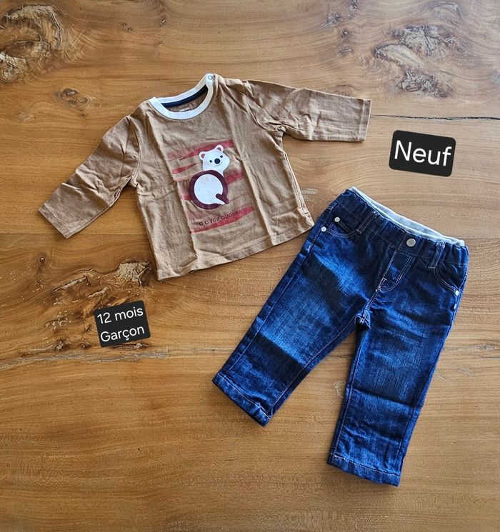 Ensemble bébé garçon : • Tee-shirt manches longues marron clair, dessin imprimé d'un panda sur le devant. Ouverture pressionnée à l'épaule. • Pantalon jean droit, élastique à la taille. Poches sur le devant et derrière. Jamais porté donc neuf. Aucune tâche, ni trou 👌