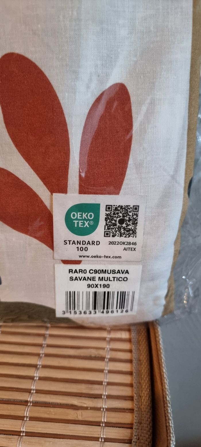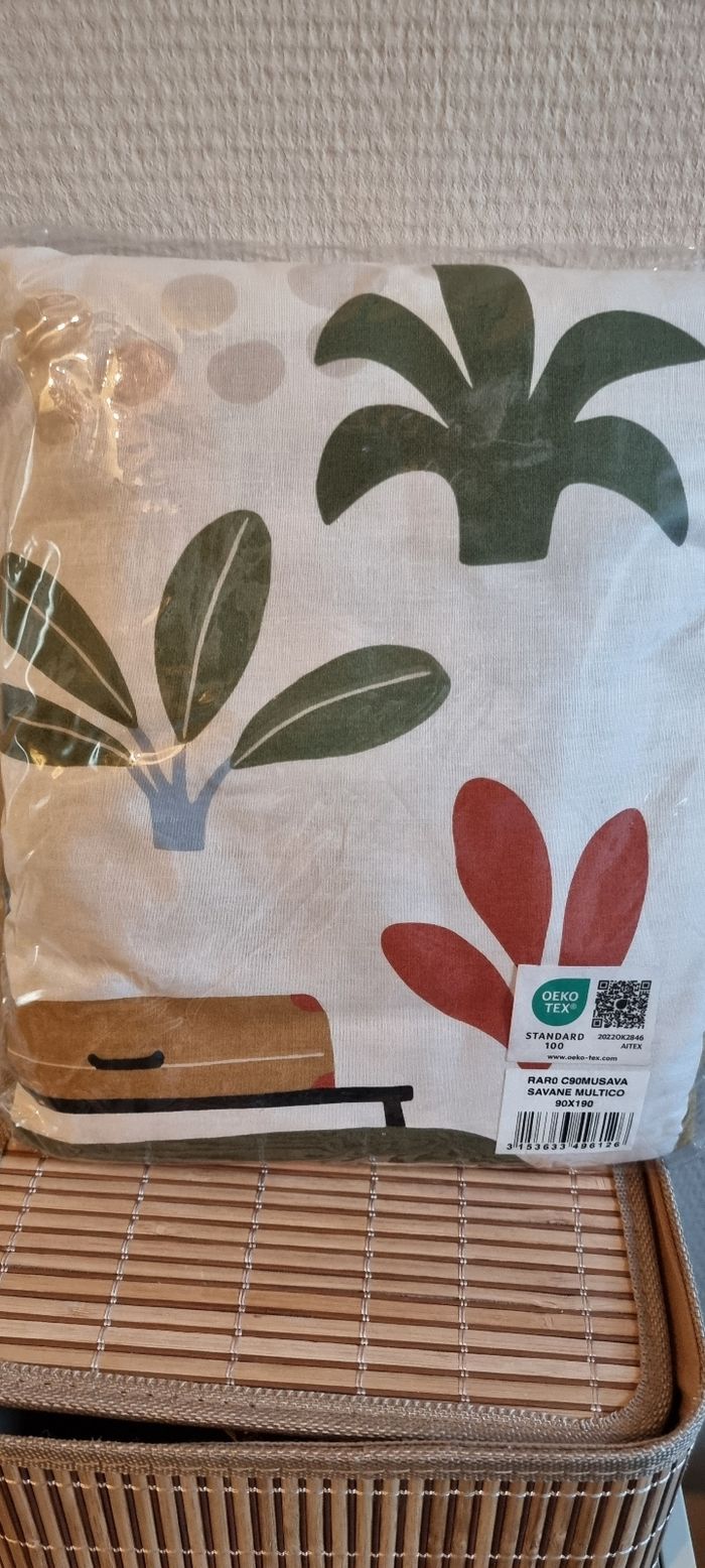 Je vends cette parure de lit en coton de dimensions 90x190 cm, avec un motif multicolore. - Type de produit : Parure de lit Bleu câlin - Matière : Coton - Dimensions : 90 x 190 cm - Couleur : Multicolore État neuf N'hésitez pas à me contacter pour plus d'informations.