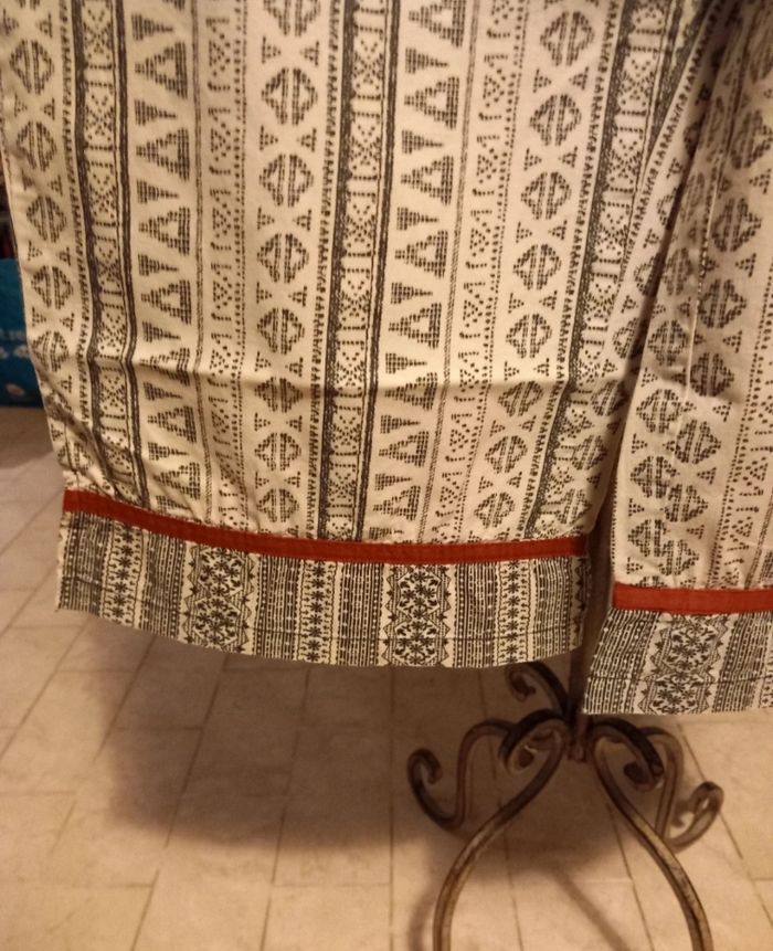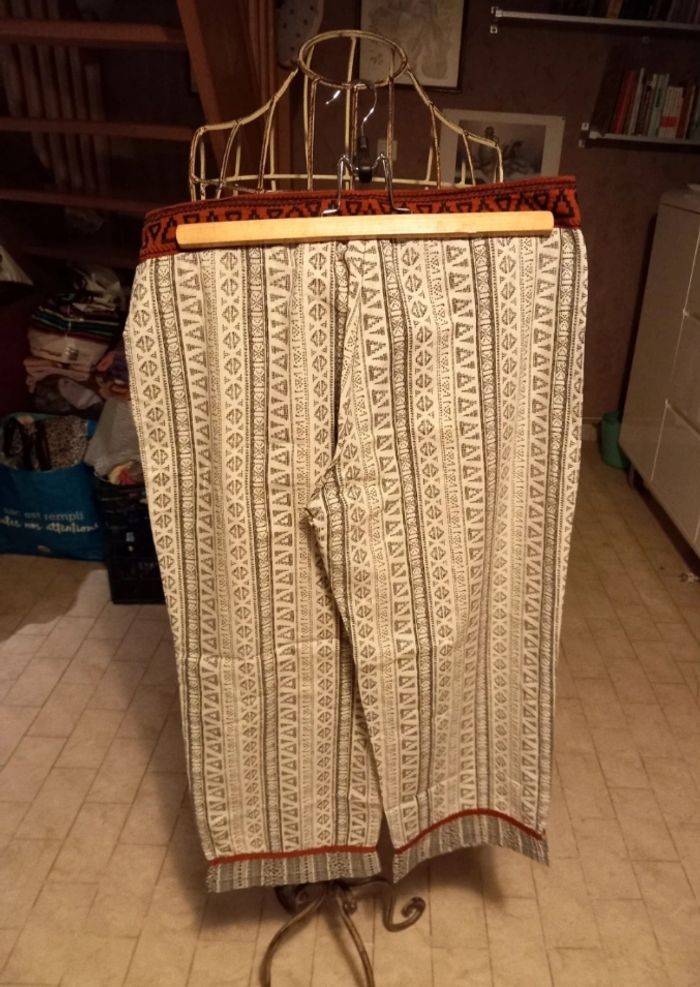 Motifs géométriques élégants Liseré rouge en bas des jambières rappelé au niveau de la ceinture Porté une fois Marque : Jacqueline Riu De nombreux autres vêtements adultes diverses tailles dans ma boutique.