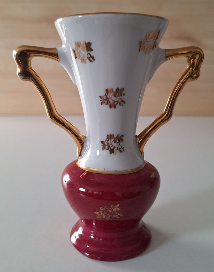 Petit vase en porcelaine blanc, bordeaux et doré - photo numéro 1
