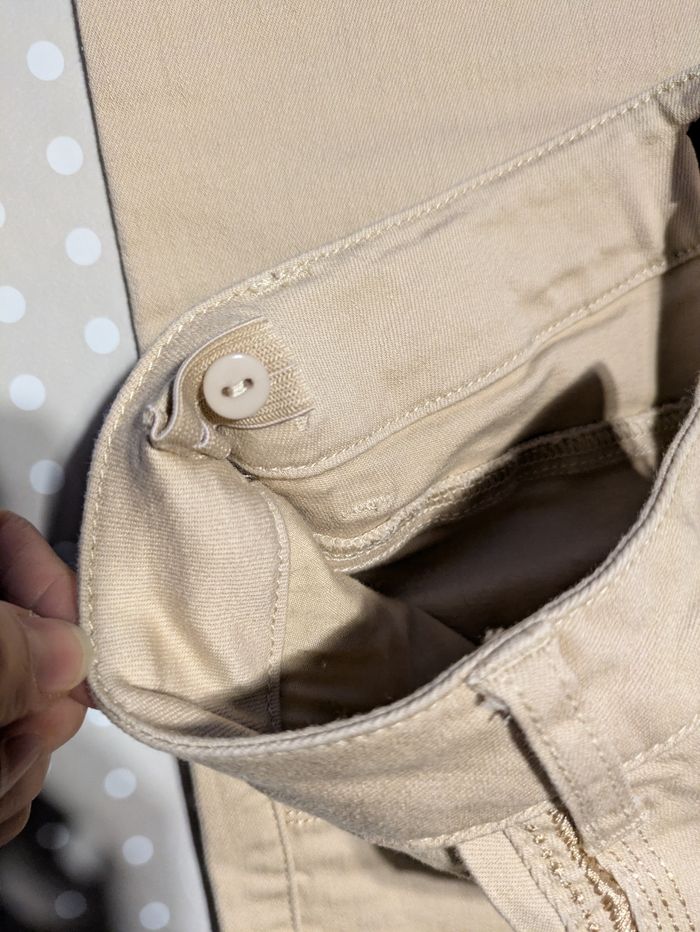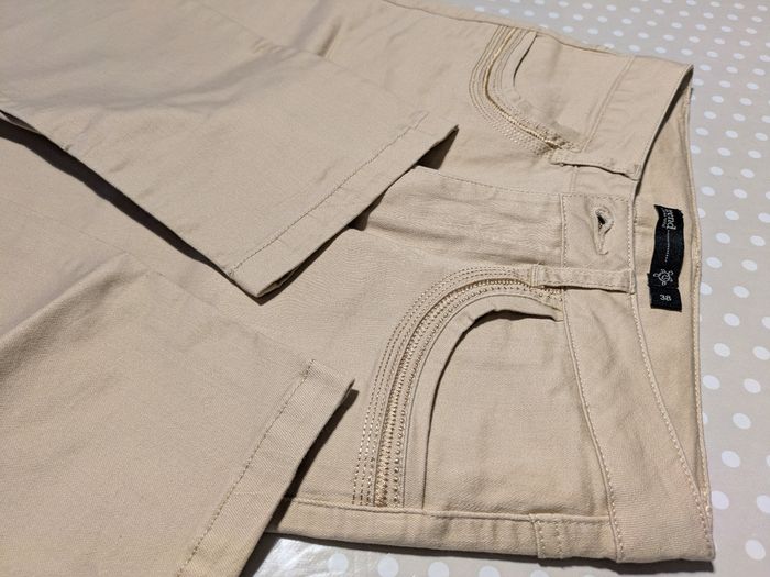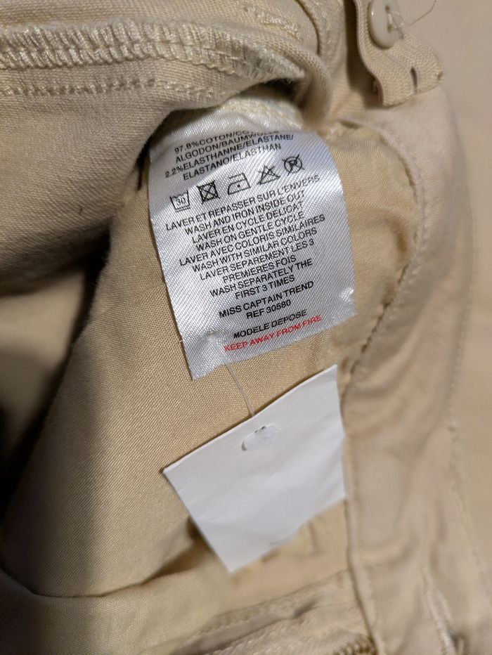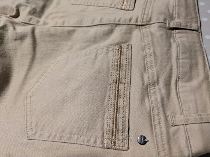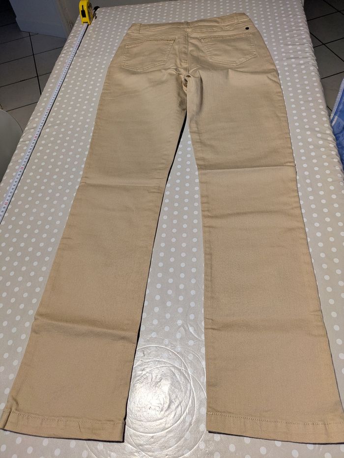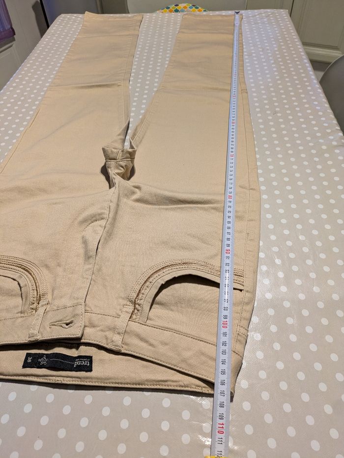 Tout neuf avec son emballage d'origine et son bouton de rechange, joli pantalon jean femme 38 beige foncé de marque Trend de chez Captain Tortue. Broderies autour des 2 poches avant et sur les poches arrière. Taille plutôt haute. Coupe droite. Matière élastique car 2.2% d'élastanne, le reste en coton. Taille réglable par un élastique à l'intérieur. Toutes les dimensions sont visibles sur les photos. Belle qualité mais c'est trop petit pour moi hélas. La couleur ? Ce qui est le plus proche de la réalité c'est la couleur de la mesure du bas du pantalon et de la vue arrière du jean. Réductions sur les lots activées. A disposition pour toute question.