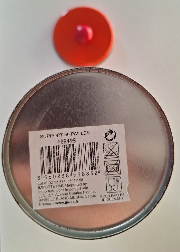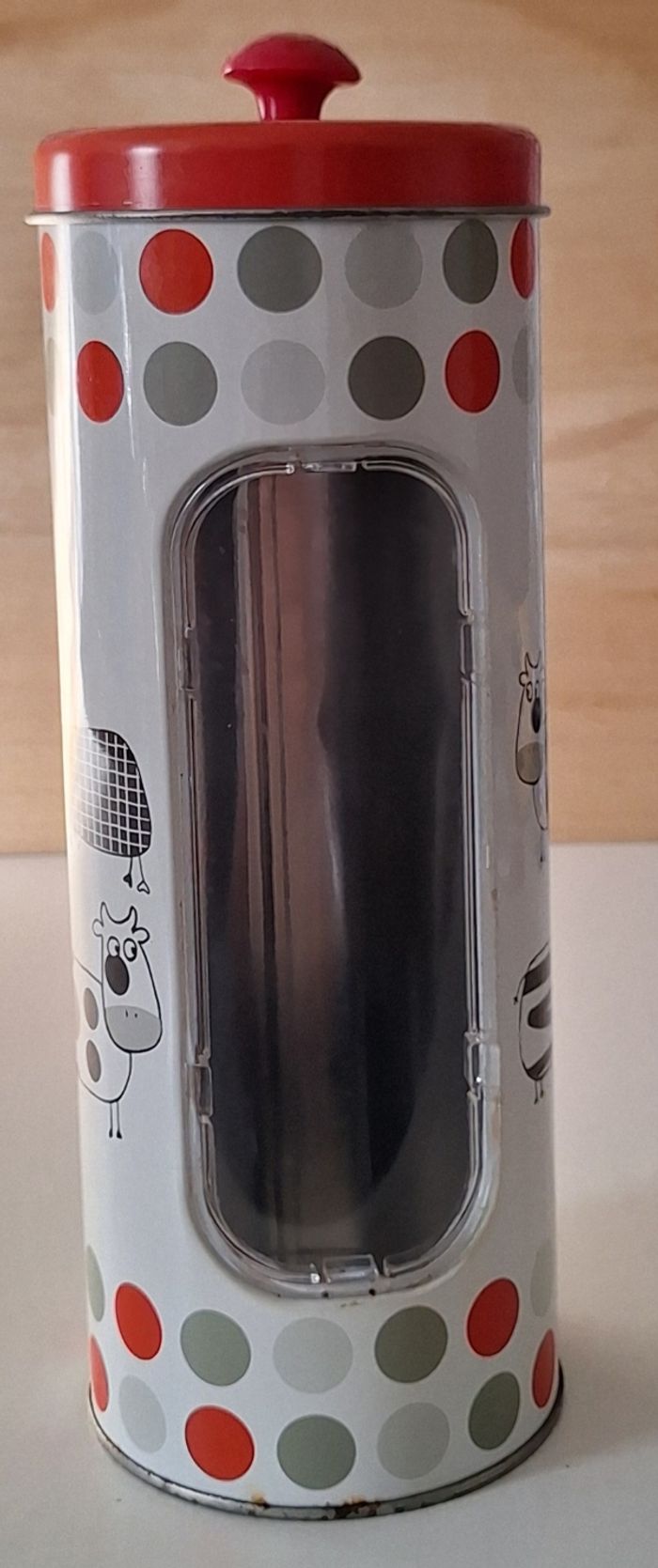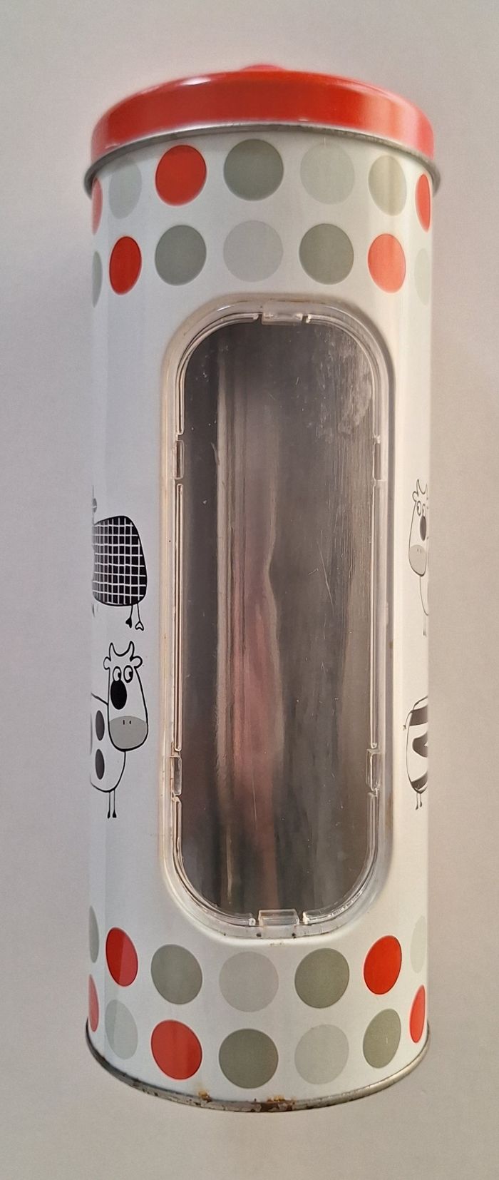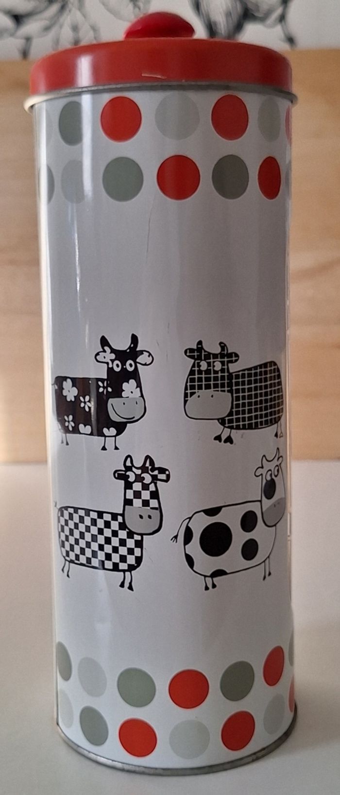 Boîte en métal de 22 cm de hauteur avec couvercle. Décor "vaches" avec une partie en plastique transparent pour voir I'intérieur. Je m'en servais pour mettre mes dosettes de café, mais sur l'étiquette, c'est noté "pour pailles". Un peu rouillée sur le bas.