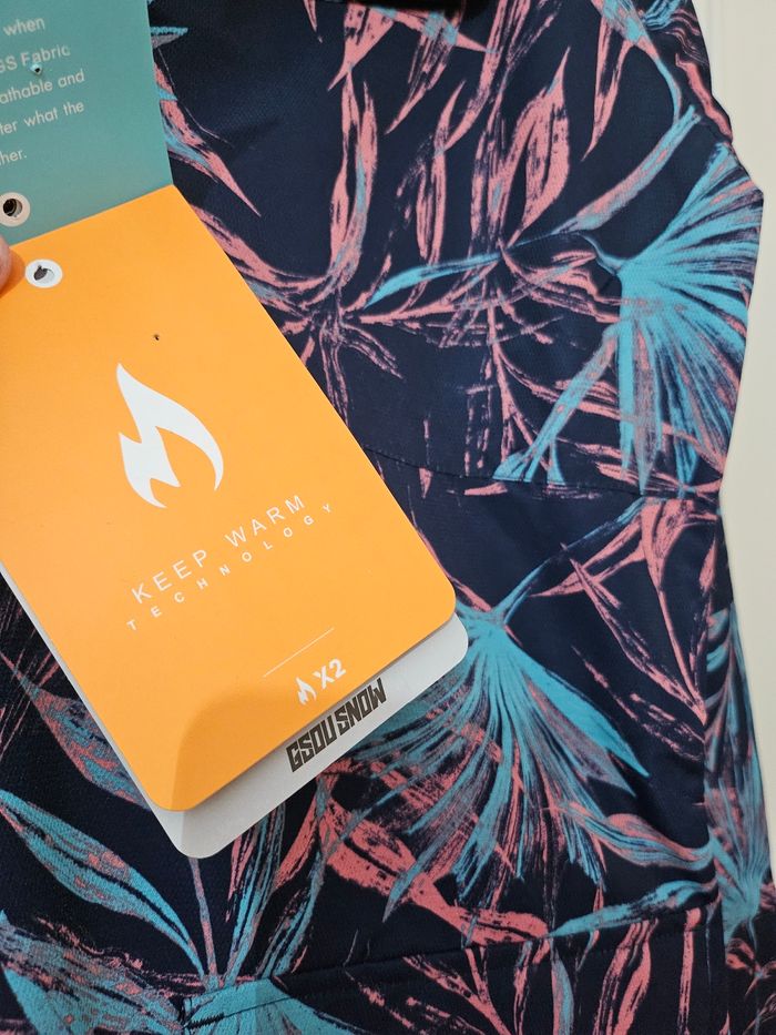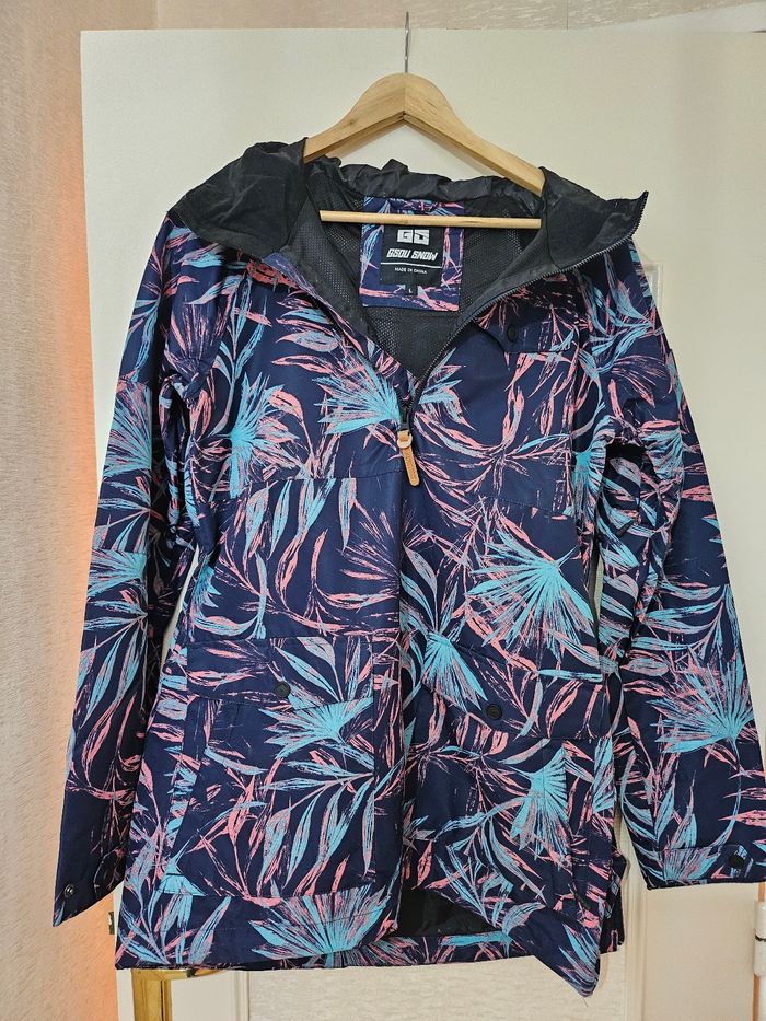 Très bel anorak de ski motif fleuri, neuve avec étiquette marque Gsou Snow, taille L (taille petit) 2 poches zippées extérieures + 1 poche a scratch, jupe pare neige (ceinture), Technologies waterproof & Keep Warm Valeur 120€, vendue 50€