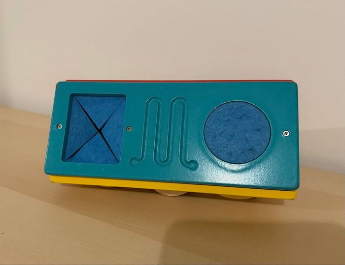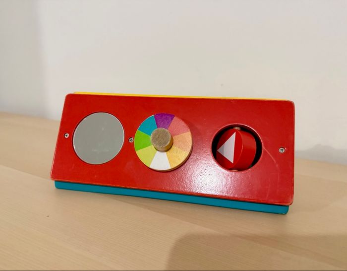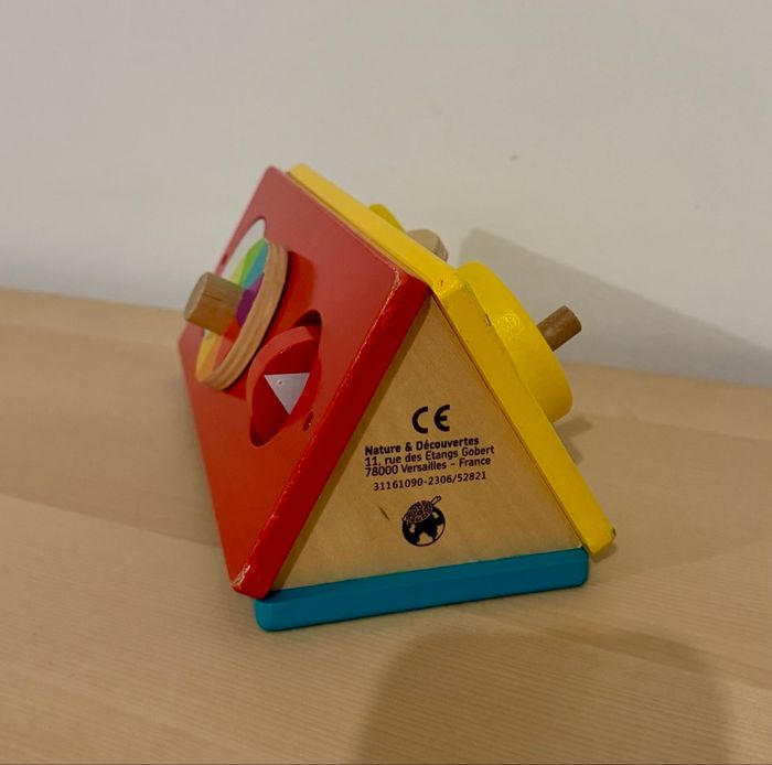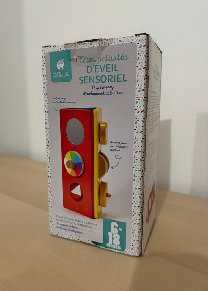 Vends jouet d’activités sensoriel en bois, 3 faces conçues pour stimuler la motricité fine, les textures, les sons et les couleurs. Marque : nature et découvertes En bon état général, quelques signes d’usure du bois sur les coins mais encore très fonctionnel. Vendu avec la boîte d’origine