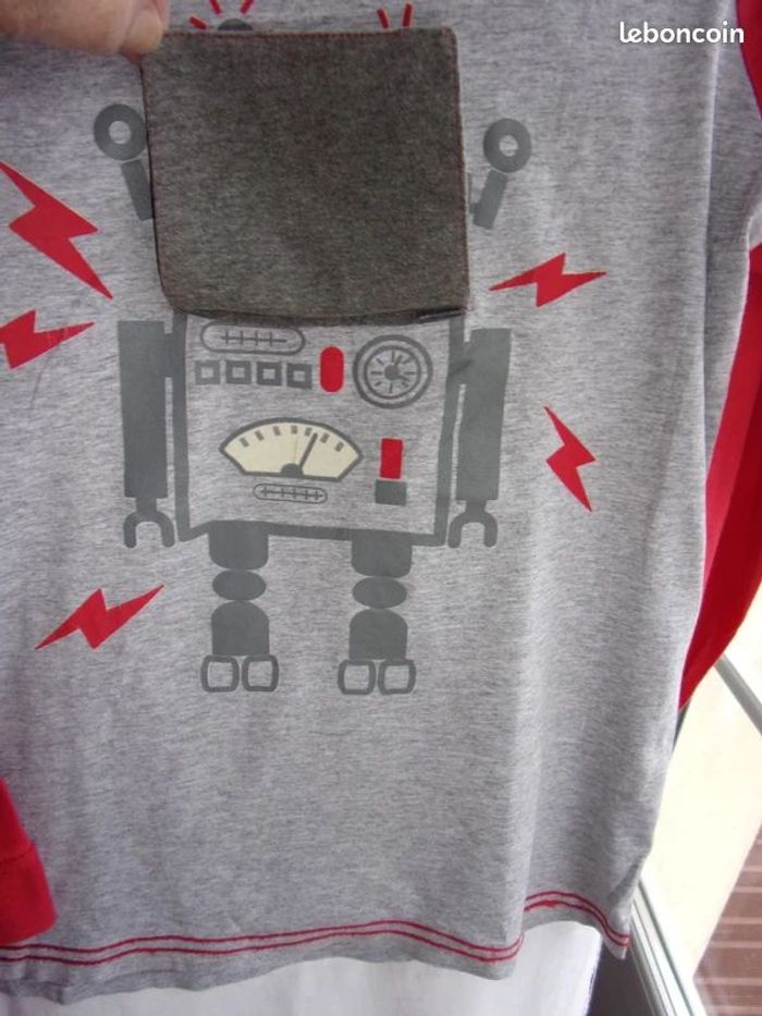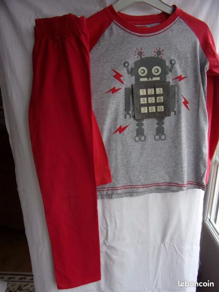 Pyjama 2 pièces - 10 ans Haut gris avec motif et poche à rabat Bas rouge Coton qualité Tissaia Manches longues Excellent état.