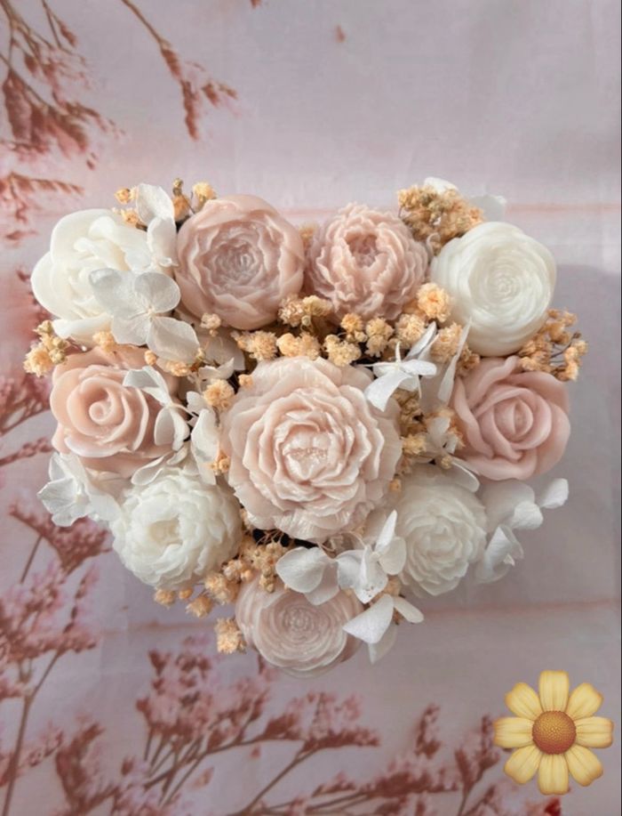 Bouquet de fondants (fleur de cire) et fleurs séchées en forme de cœur. - Senteur orange cannelle citron / linge propre / cerise/ eucalyptus/ musc blanc/pêche Emballé avec soin. N’hésitez pas à me contacter pour plus de renseignements.