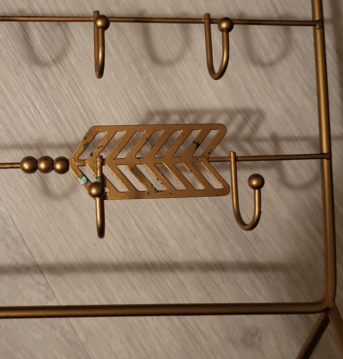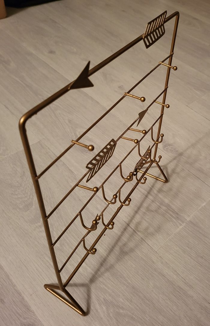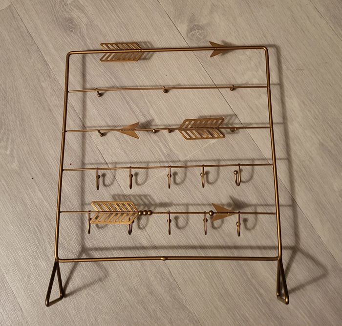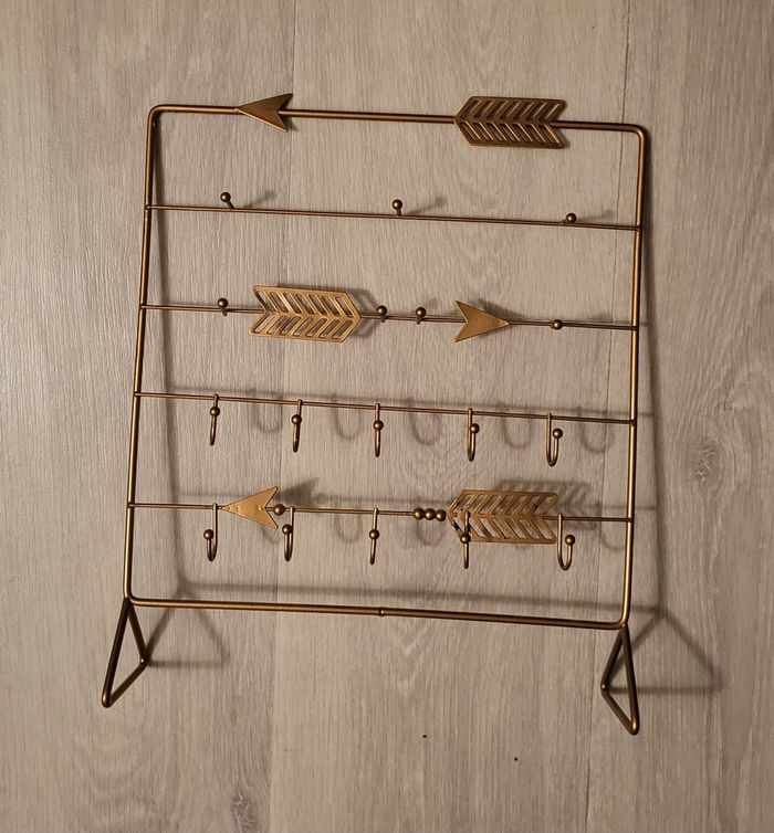 A poser. Hauteur 29 cm, largeur 25 cm, permet d'accrocher bagues, boucles d'oreilles, colliers. De petites tâches sur la flèche en bas à droite.