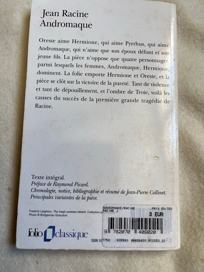 Vends ce livre de poche de racine titre Andromaque préface de Raymond Picard édition de Jean-Pierre Collinet folio classique code 9782070409020 1 euro Mes autres annonces de livre #lma42livre