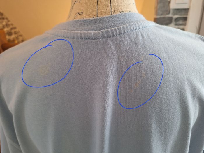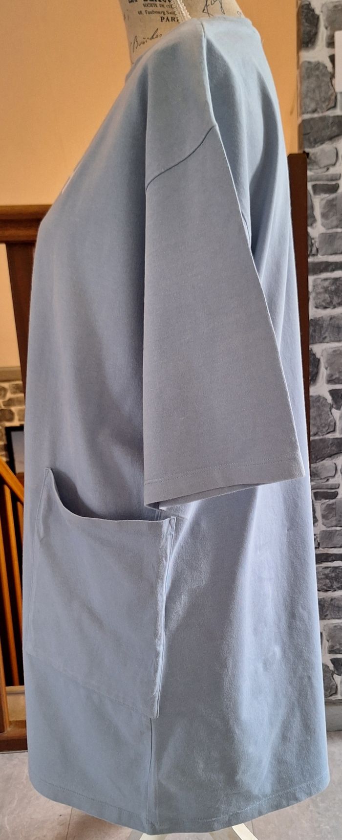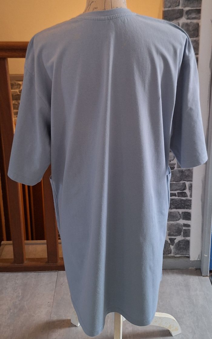 Chemise de nuit oversize à manches 3/4. Deux grandes poches. Malheureusement il y a une grande auréole devant et deux petites auréoles à la nuque. Hauteur 85 cm. 100 % coton.
