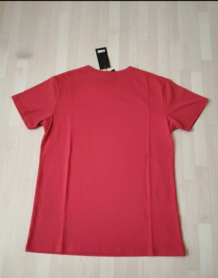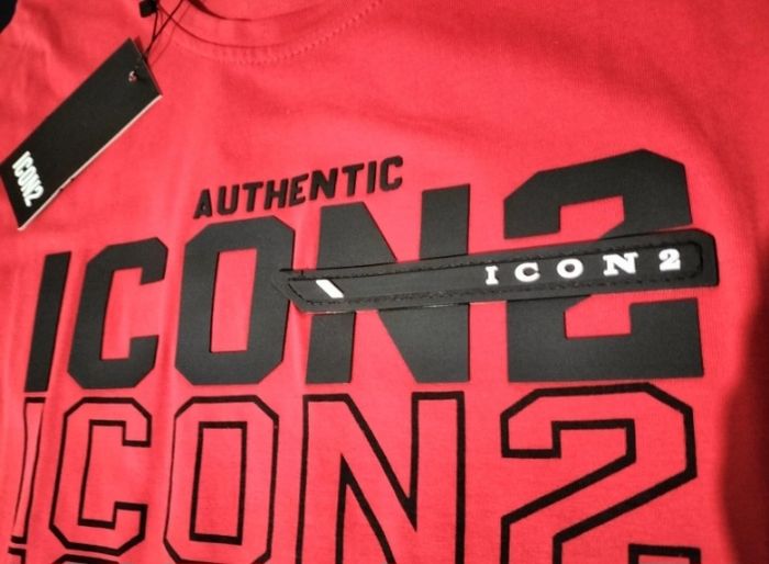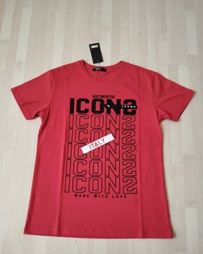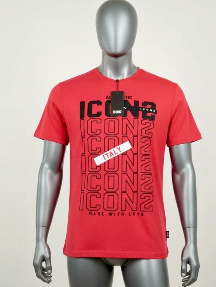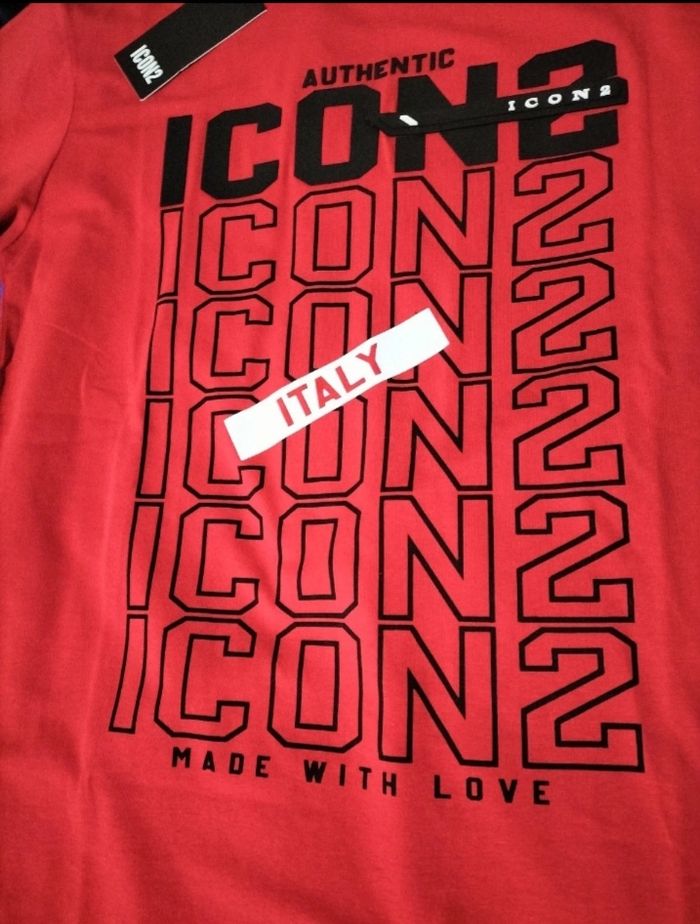 ​Marca: ICON2. ​Estado: Nuevo con etiqueta. ​Talla: M (Corte estándar/regular). ​Color: Rojo con gráficos en negro y detalle "ITALY" en blanco/rojo. ​Diseño: Estampado vertical "ICON2" con letras engomadas/relieve en la parte superior y la frase "Made with love" en la base.