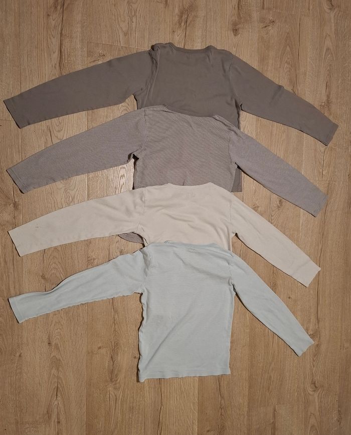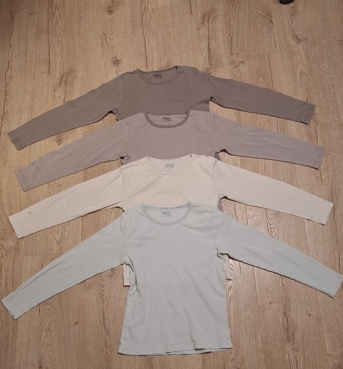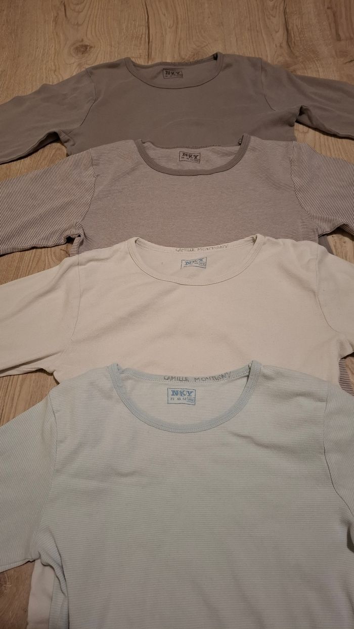 #loluxiagarcon10ans #loluxiagarcon11ans #loluxiagarcon12ans Lot de 4 tee-shirts à manches longues, type sous-vetements coton. Idéal froid ou hiver. 2 unis et 2 à micro rayures Le blanc est tâché, cf photos. 10-12ans marque NKY de Kiabi Encolure marquée