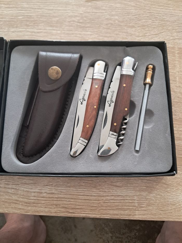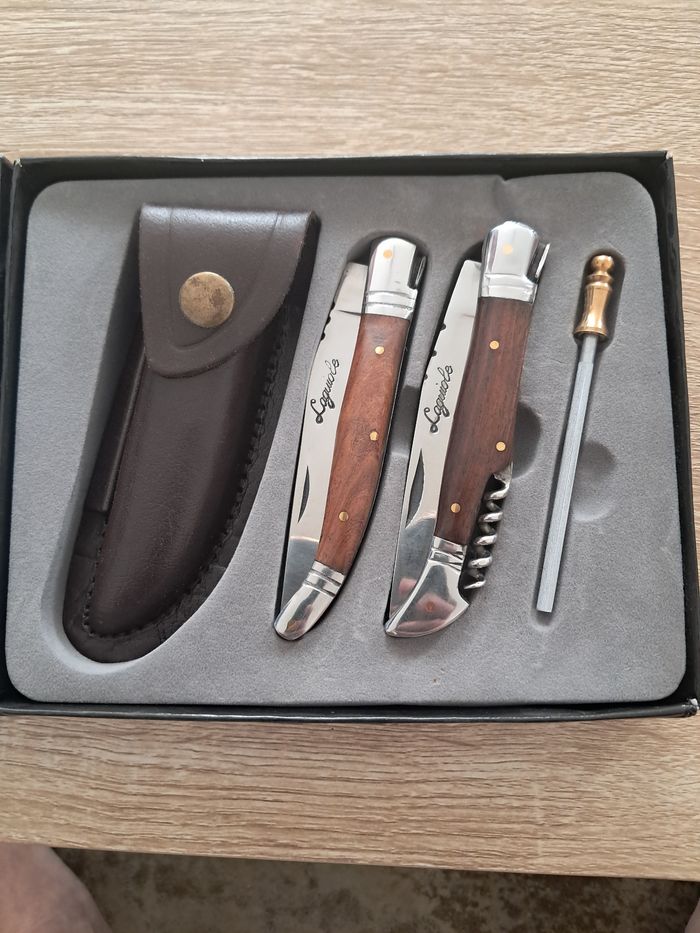Description Coffret laguiole manche en bois Un étui cuir Un aiguiseur Un couteau avec et un sans tire bouchon Dans sa boîte d'origine. Attention voir photos petit défauts