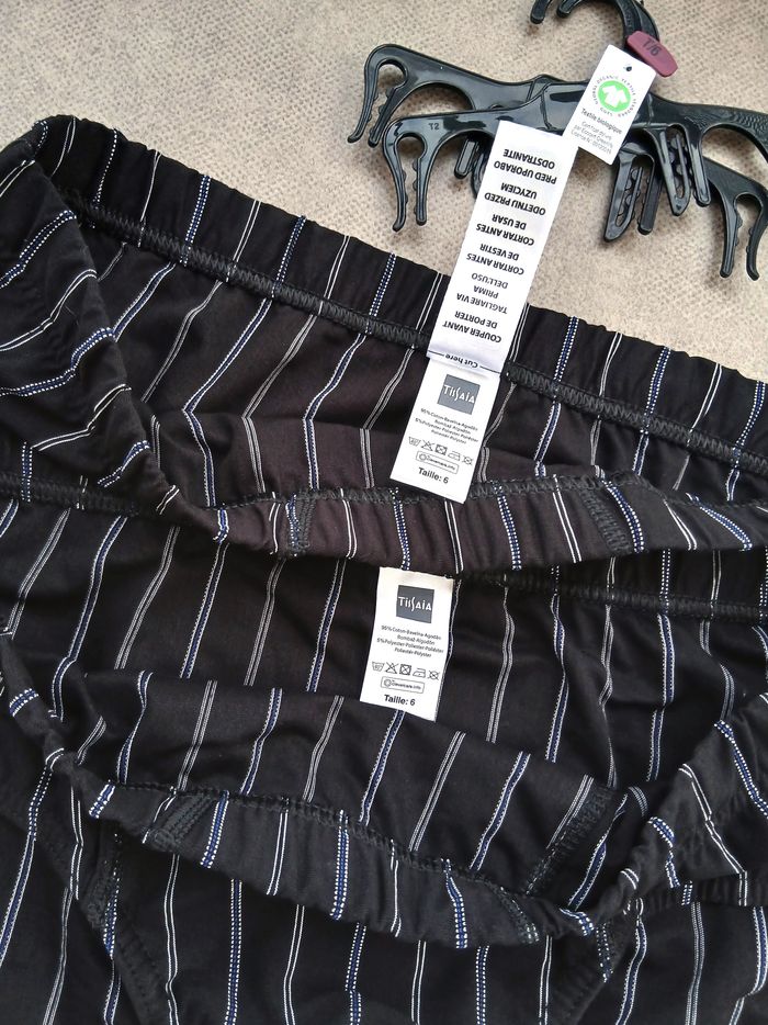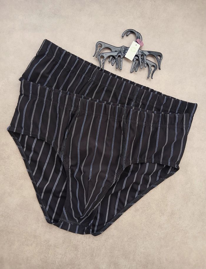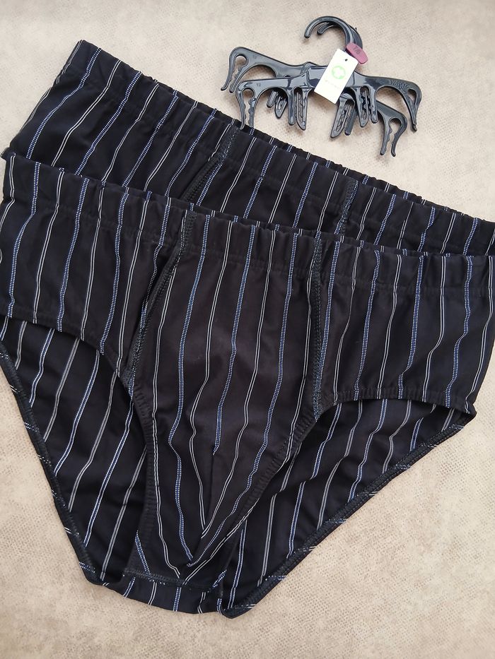 Lot de 2 slips ouverts noirs à rayures, neufs • Taille élastique • 95% Coton Biologique + 5% Polyester • Taille 6 (XXL - 52/54) ➥ Neufs • Tour de taille 80 cm (non étiré) • Profondeur 32 cm