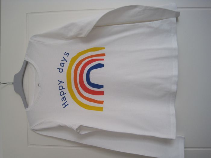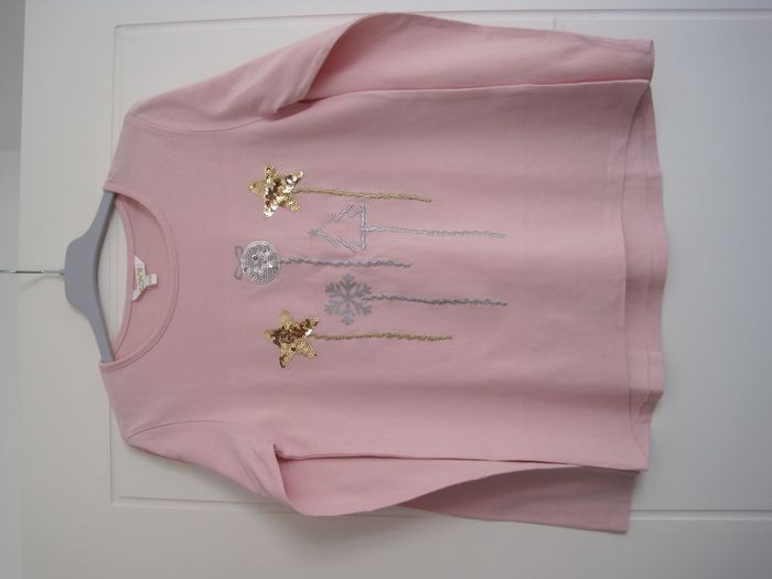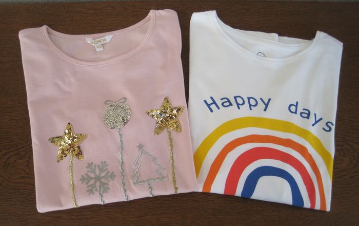 2 T-shirts manches longues à encolure ronde, en coton 1 rose avec des motifs de Noël en sequins marque Kloane et 1 blanc avec 1 arc en ciel Happy Days marque Carrefour Taille 11-12 ans Très bon état