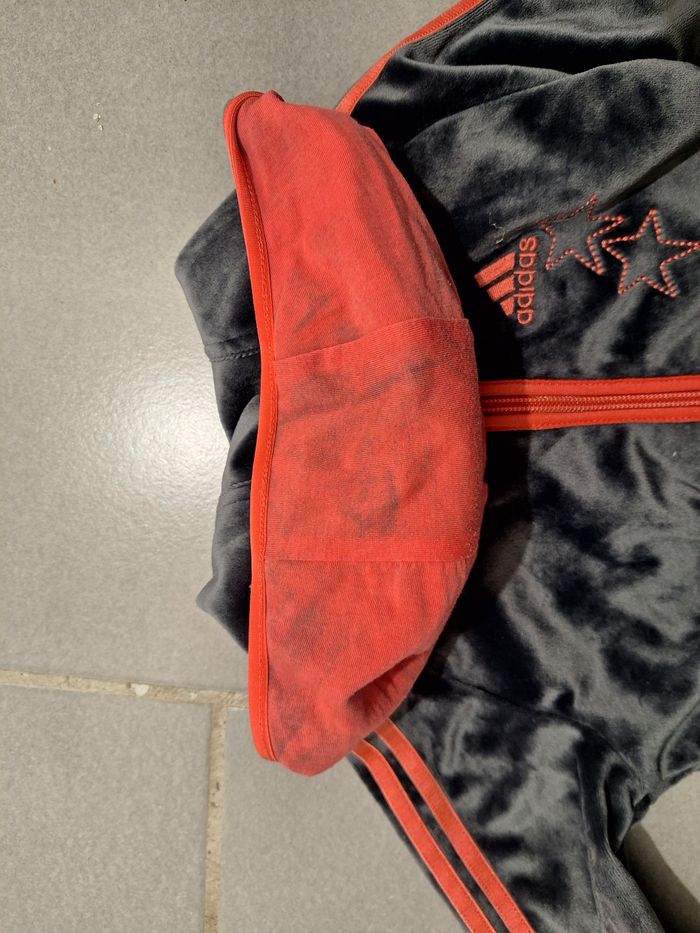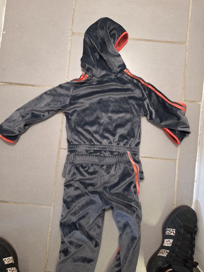 Jogging adidas gris et corail en velours 18-24mois en bon état, juste l interieur de la capuche décoloré voir photo