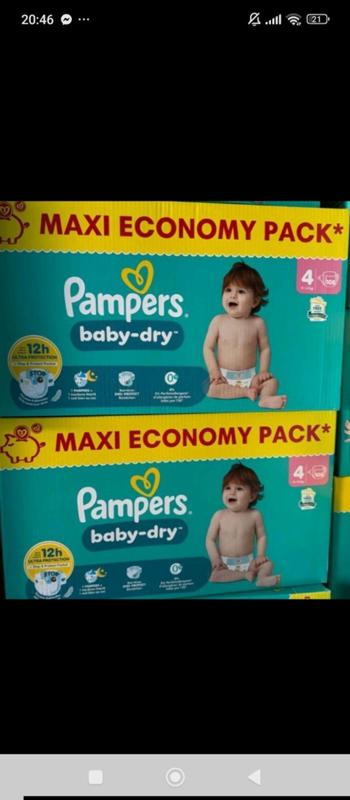 Lot de 2 cartons de couches pampers taille 4 à 40€ avec le code