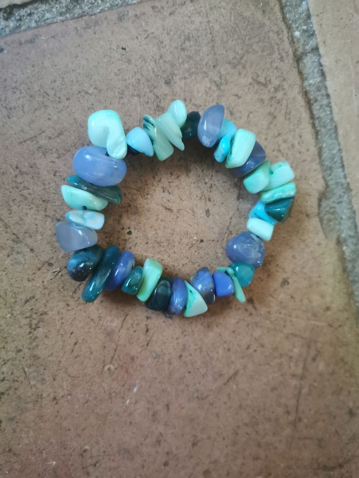 Bracelet élastique de pierres naturelles bleues et vertes de taille et forme différentes, en bon état, certaines pierres son marquées et on vit le noeud de l'élastique. Sur la phot le bracelet et sur le poignet de 16 cm, et il y a encore de la place, poids 53g.