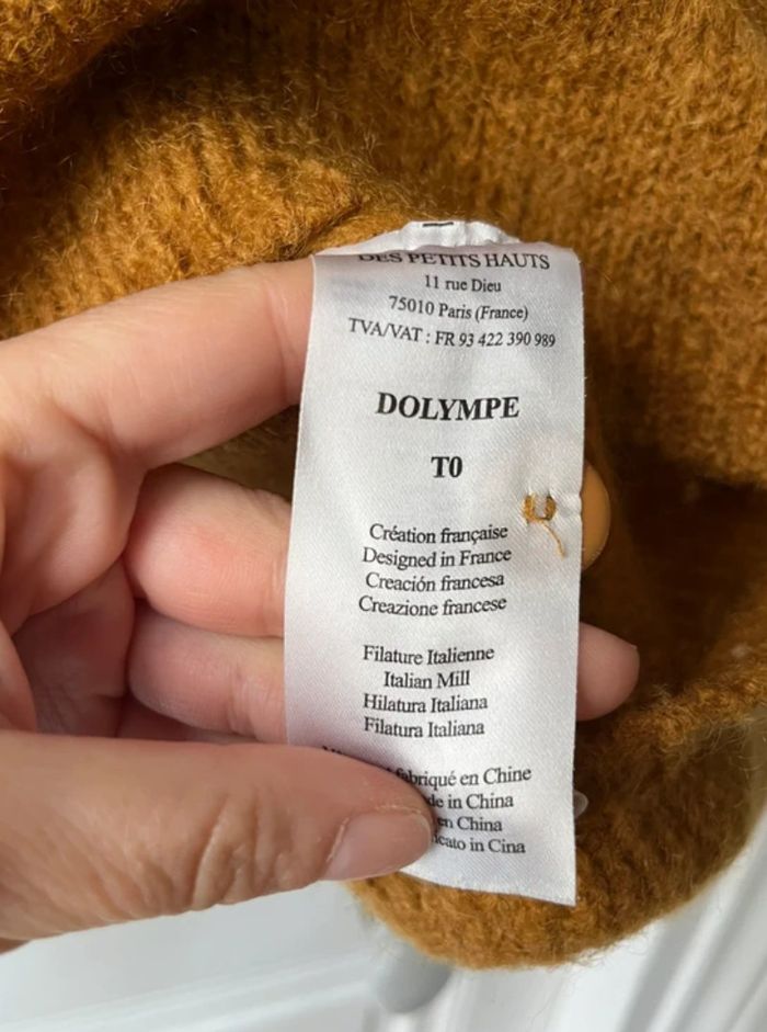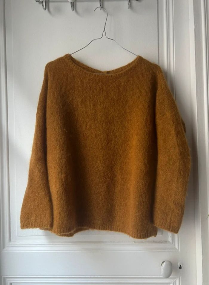Pull Des Petits Hauts, modèle Dolympe, couleur camel - moutarde Boutons dans le dos Tient chaud car contient 62% Kid Mohair, 20% Laine Indiqué taille 0 mais correspond à un 36 Parfait état