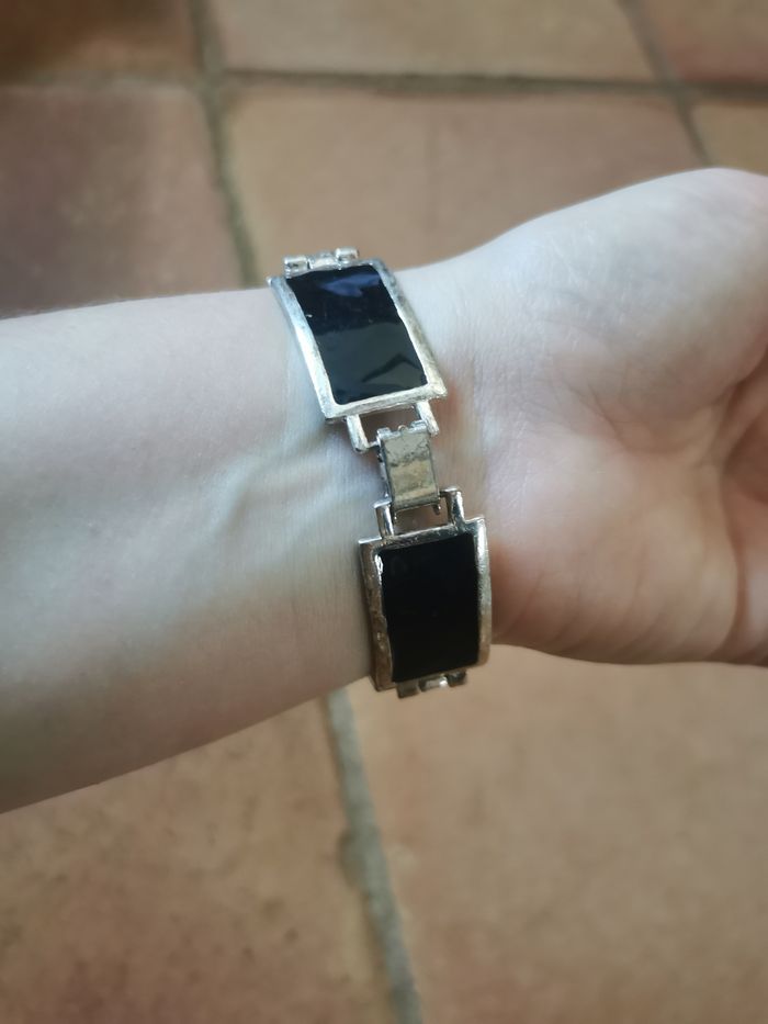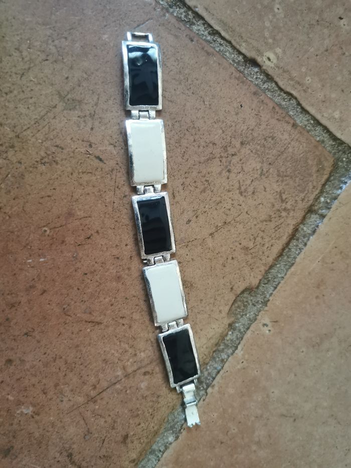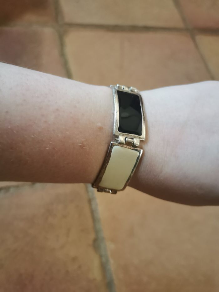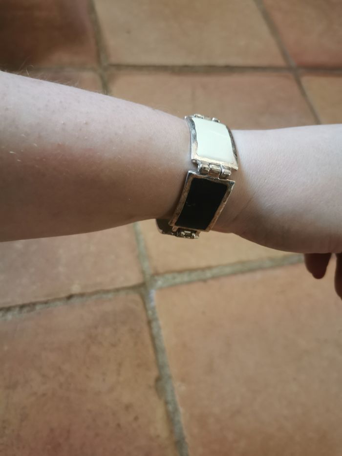 Bacelet argenté émaillé blanc et noir. Bon état général, bracelet est vintage, fermoire fonction, bracelet comporte quelques traces d'oxydation. Dimensions : Longueur : 16,5 cm Largeur : 16 mm Poids : 47g