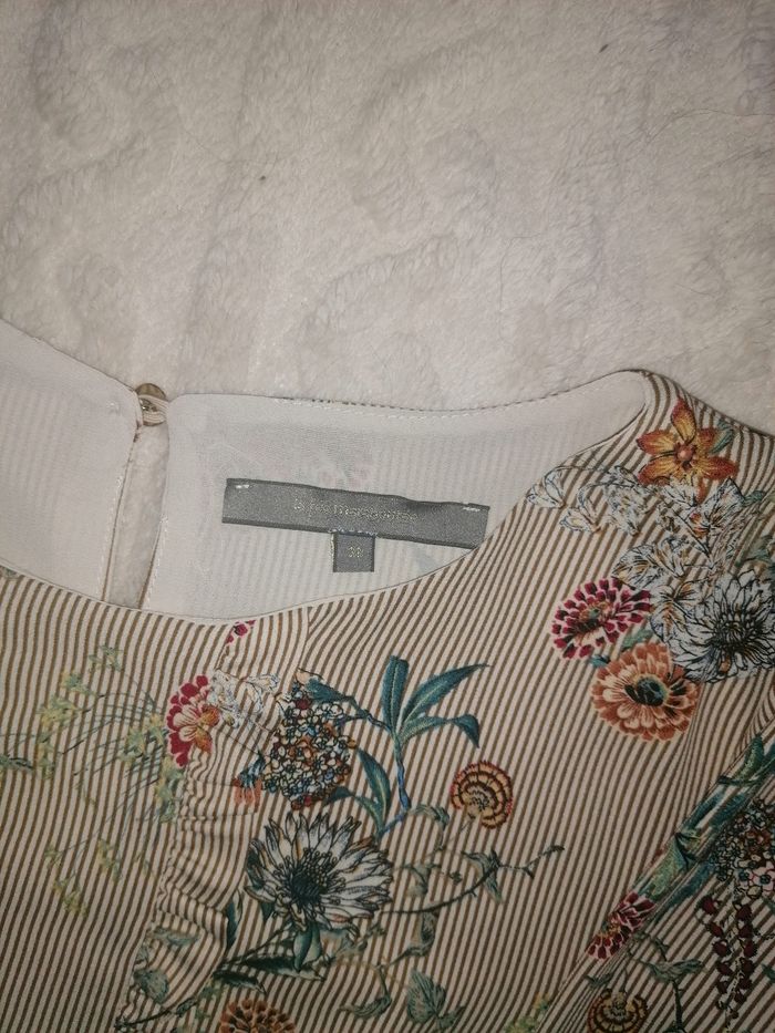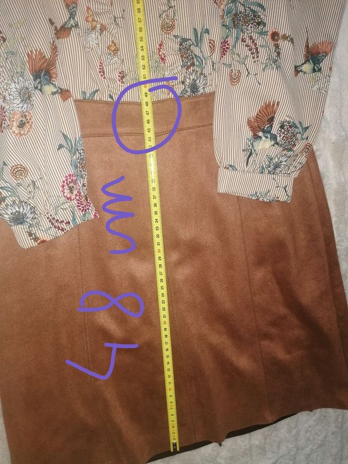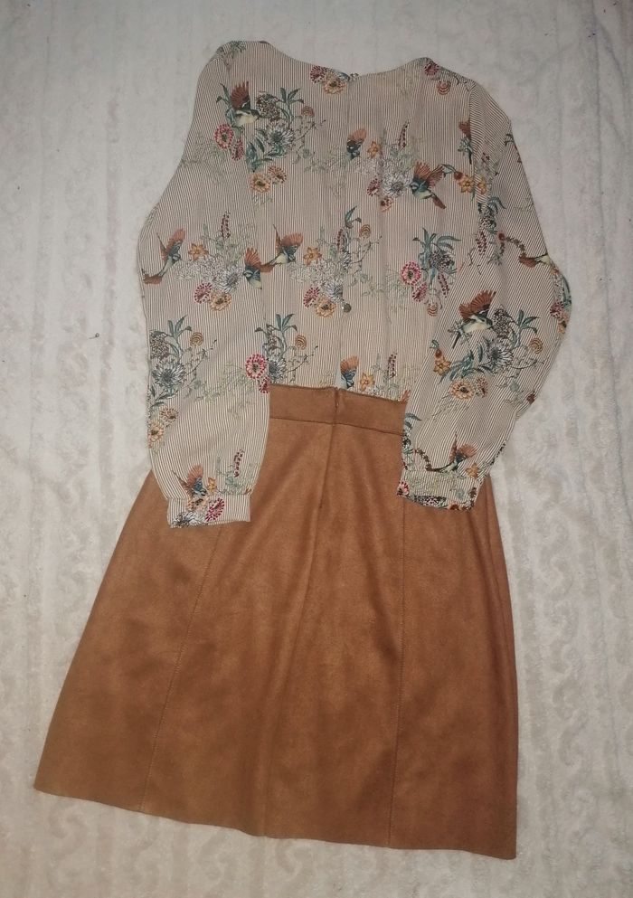 Robe vintage 38 Très belle robe, haut chemisier polyester beige à motifs fleurs et oiseaux, avec 2 volants, jupe effet suédine camel très stretch, super souple et fluide, avec ceinture. Arrive au-dessus du genou, voir les dimensions sur les photos. Fermeture éclair derrière la jupe en parfait état, boutons dans le dos du chemisier nickels. Très facile d'entretien. Très peu portée, très bon état général. Malheureusement trop petite pour moi. Achetée neuve 119 €, La Fée Maraboutée. Avec des bottes marron et un collant marron opaque, elle est super originale, féminine, vintage, intemporelle et super classe ! Ou avec des collants couleur peau et des baskets blanches.. Look vintage, je m'en sépare avec regret. Faites un lot, 10% de remise dès 5 articles achetés !! 🤎🤍🤎