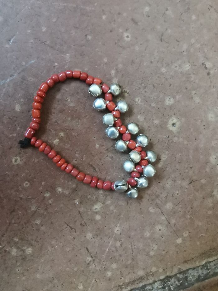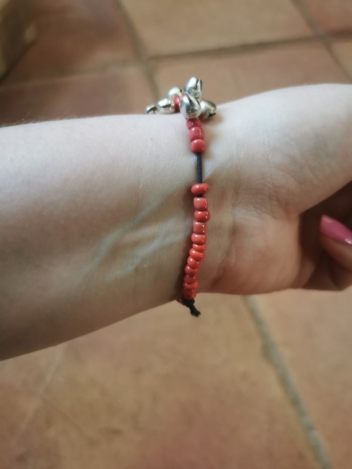 Bracelet élastique de perles couleur corail et les grelots argentés. Petit bracelet, en très bon état, juste le noeud d'élastique est visible, sur la photo ce bracelet est sur le poignet de 16 cm, poids du bracelet 10g.