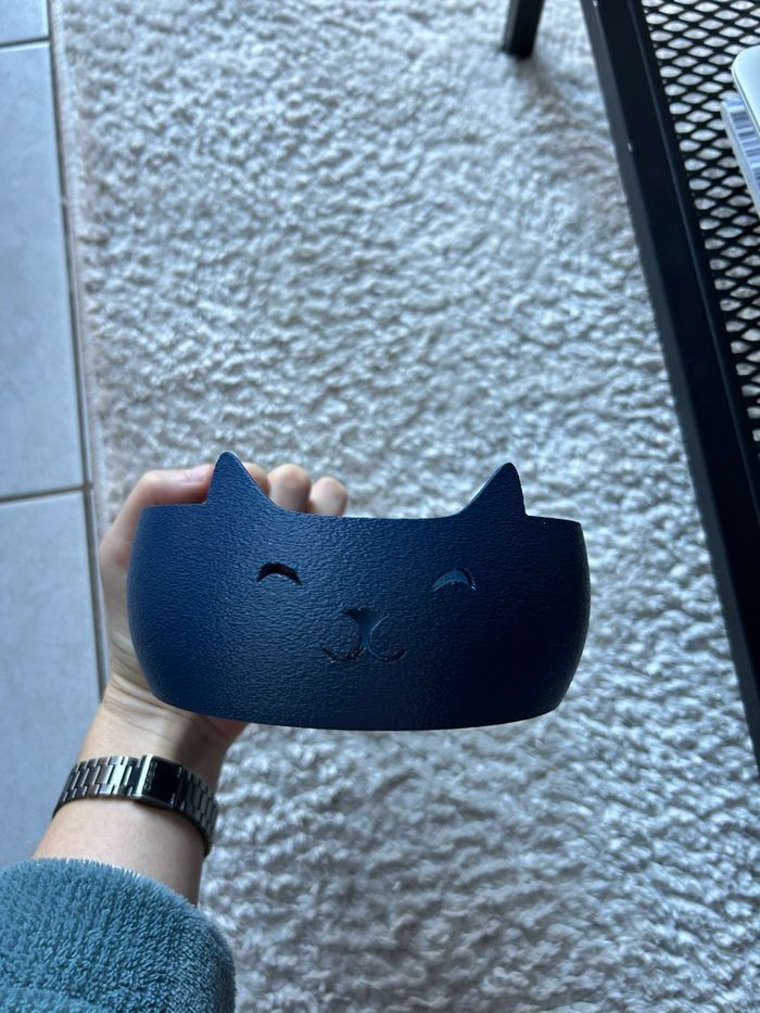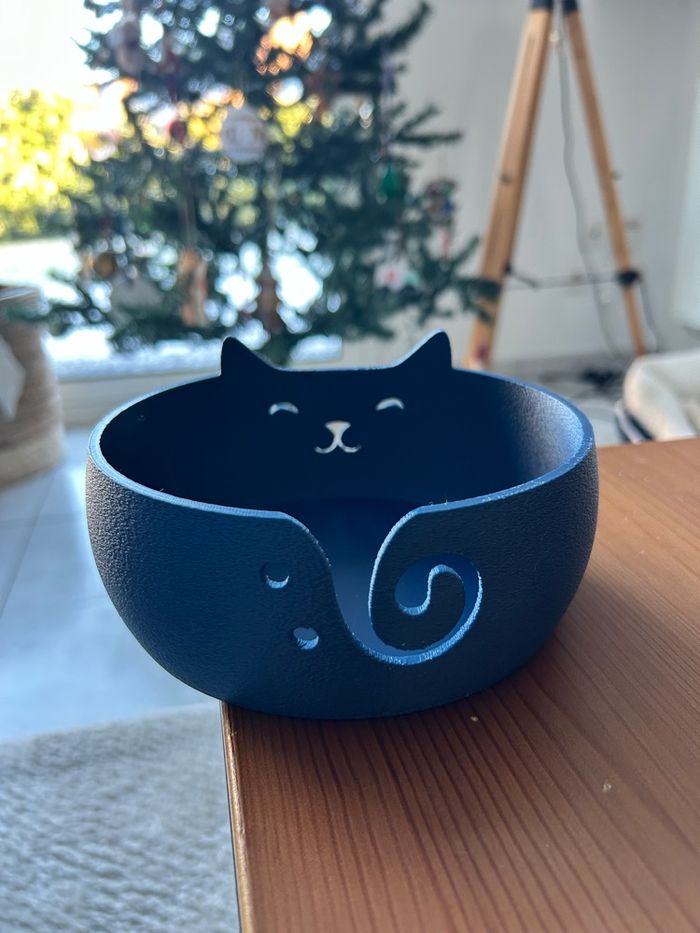 Bol chat bleu marine dérouleur de pelote de laine. La pelote de laine doit être positionnée dans le bol et la ficelle passe par l’ouverture arrière (queue du chat) Pratique et décoratif !