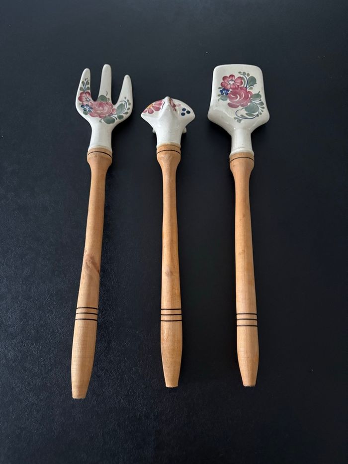 Lot de 3 couverts manche en bois et porcelaine fleurie Ensemble d'ustensiles vintage en porcelaine wtoctawek poland et en bois. - photo numéro 1