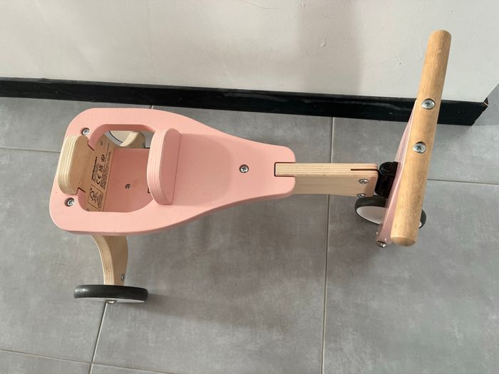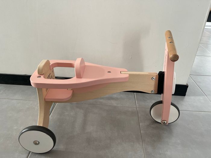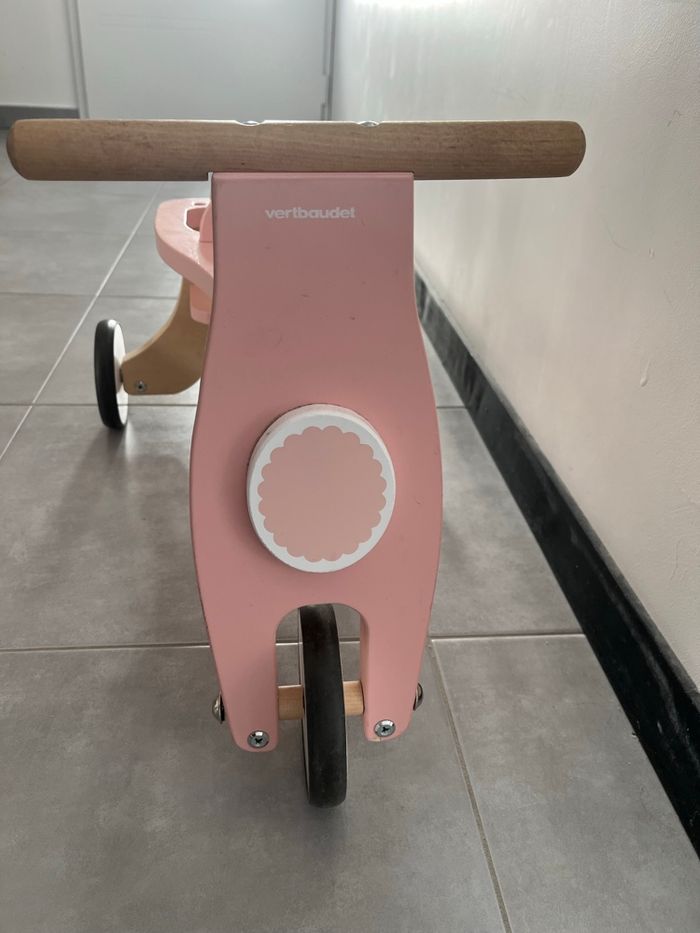 Tricycle en bois rose de chez vertbaudet Avec siège à l’arrière pour mettre doudou ou poupée. En très bon état.