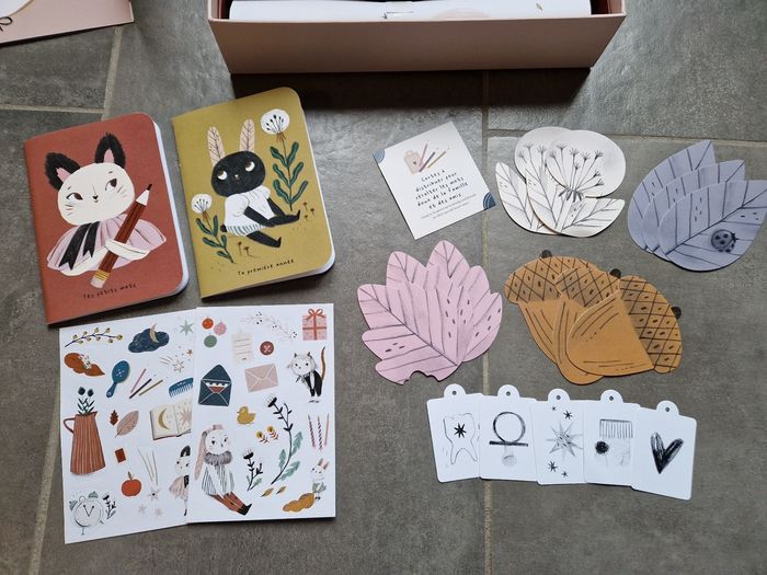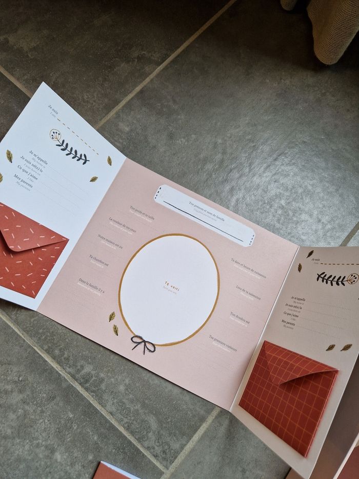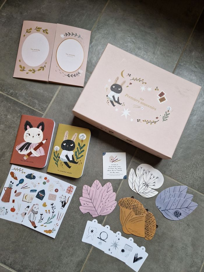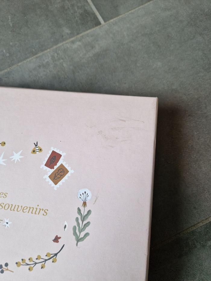 Boîte premiers souvenirs moulin roty pour naissance. Pas servie. Il y a aussi un poster arbre généalogique que je n'ai pas déroulé. Une tâche à noter, voir photo