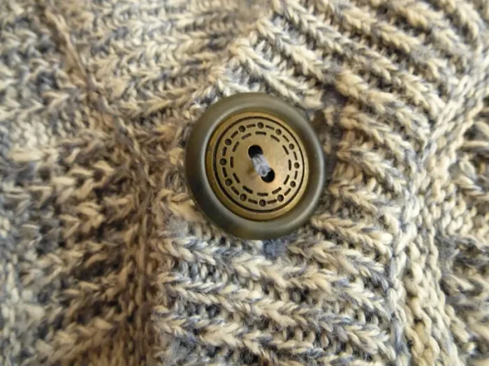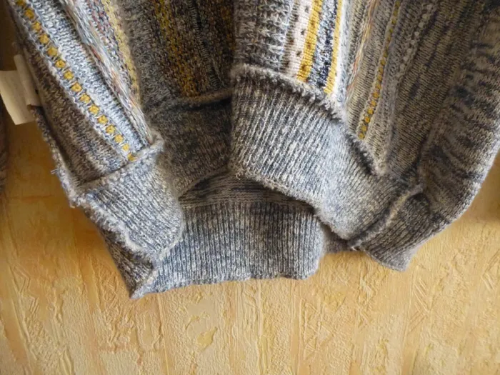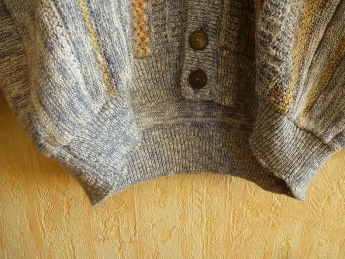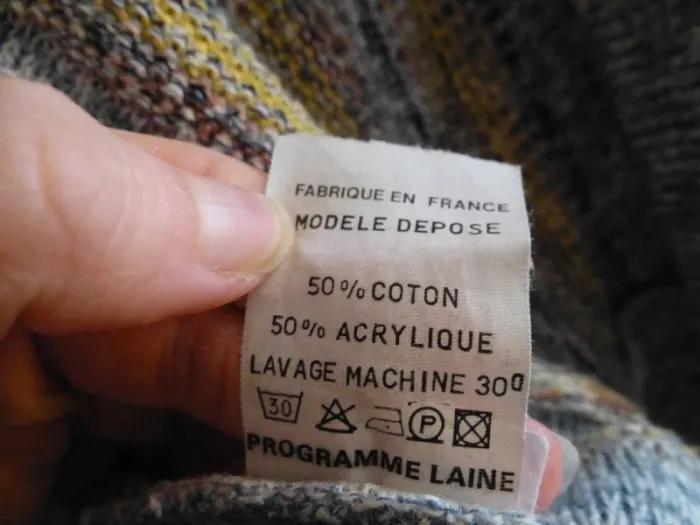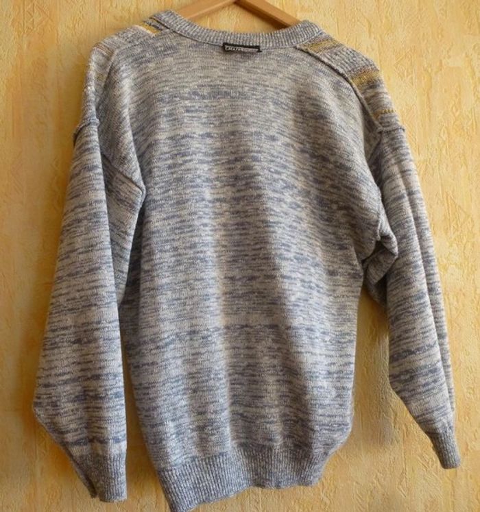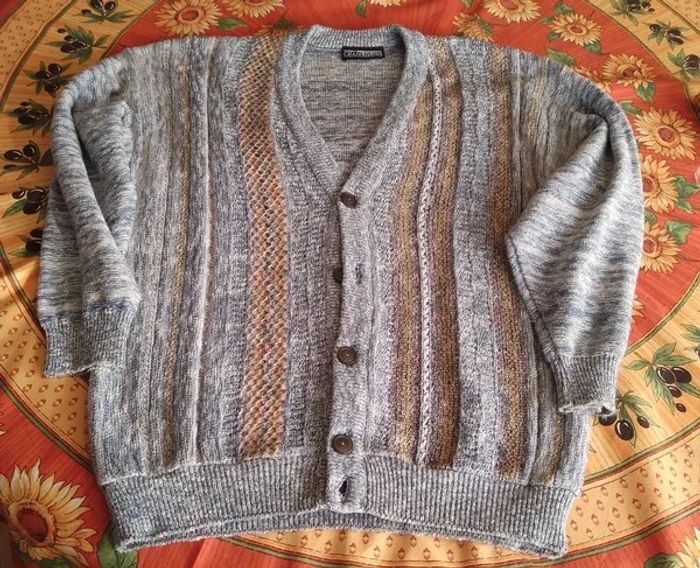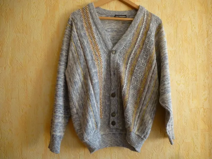 Porté très peu souvent, col en V, avec une série de 5 boutons brun autour et couleur dorée au centre et avec des lignes ajourées, avec des stries grise clair et grise foncé, avec deux faces avec un décor indépendant avec 3 lignes orangé et ajourées par deux motifs formant des trous. Et l'autre4 lignes avec des couleurs jaunes. Le bas du vêtement et des manches est avec des lignes serrées. Le derrière n a rien en motifs. Modèle déposée , fabriquée en France, Modèle déposé, avec 50% coton, et 50 % acrylique, lavage machine 30°C programme laine et peut se repasser. Avec étiquette marqué D sûrement pour modèle déposé. Longueur d'aisselles à aisselles : 55 cm #chairman #chiné #TailleL #Cardiganshomme #Hiver