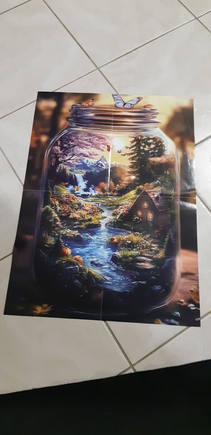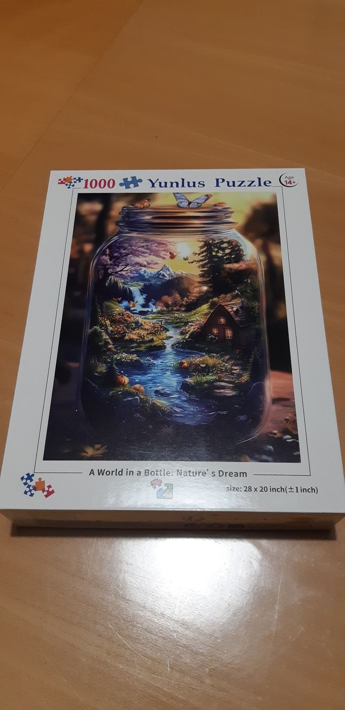 Puzzle 1000 pièces Un monde en bouteille : Rêve de la nature Motif original, c'est un paysage de montagne enfermé dans une bouteille Complet Très bon état Il y a des lettres au dos pour faciliter le tri si besoin. Il y a aussi un poster à taille réelle du puzzle si on veut le faire dessus. Pièces solides et de très bonne qualité Taille 50x70 Fait une seule fois Les pièces ont été replacées dans un sac de congélation pour éviter les pertes J'ai plein d'autres articles et je fais des réductions dès 2 articles achetés.