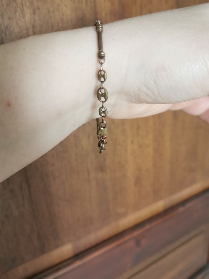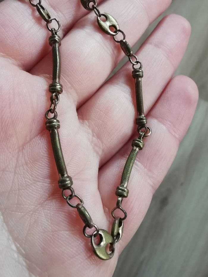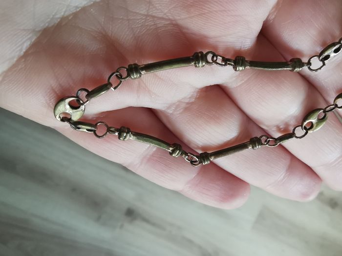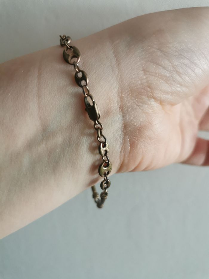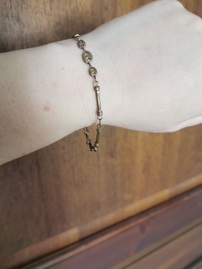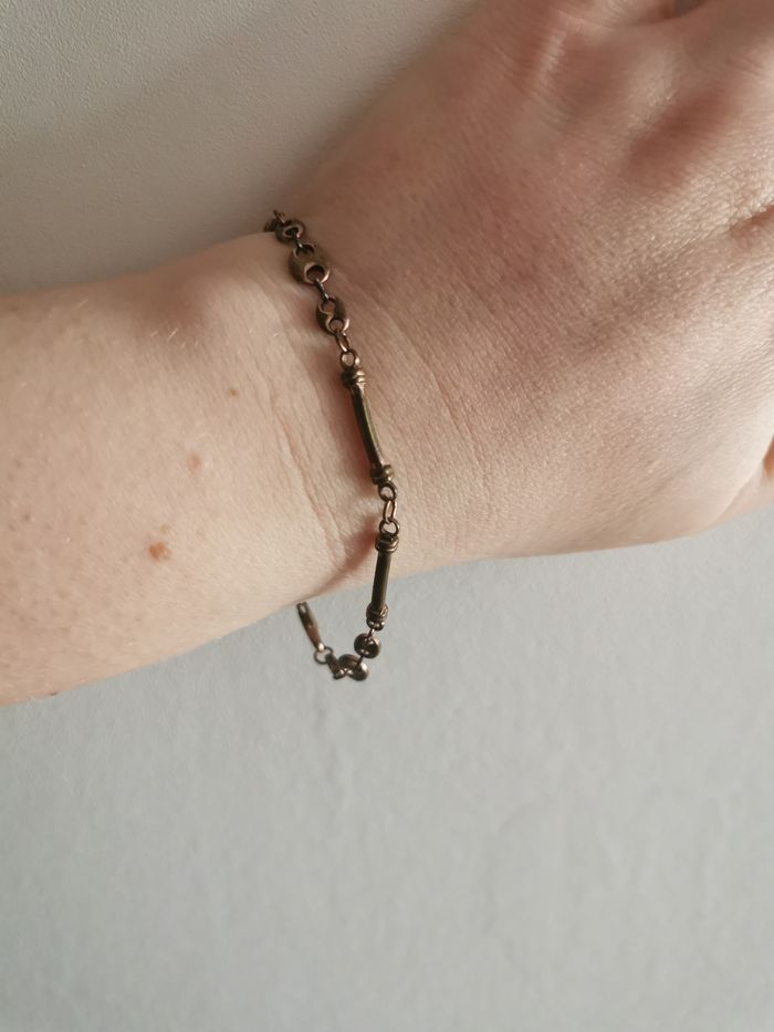 Bracelet gourmette vintage en acier perles batons, couleur cuivrée. Bracelet très fin, en bon état. Dimensions : Longueur : 18,5 cm Poids : 6g
