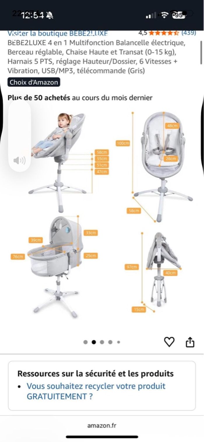 Balancelle de la marque bébé2luxe 4 fonction disponible : Mode BERCEAU Mode BALANCELLE ELECTRIQUE Mode CHAISE HAUTE Mode TRANSAT