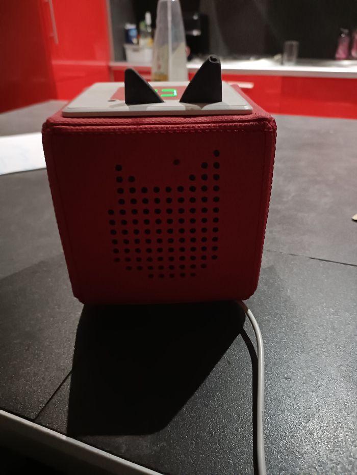 Toniebox rouge : une oreille est légèrement abîmée mais n'empêche pas le fonctionnement, vendu avec chargeur qui est un peu abîmé au niveau du câble.
