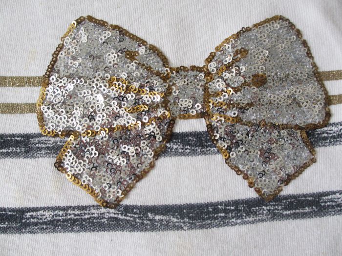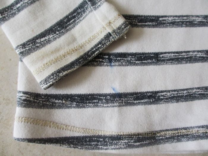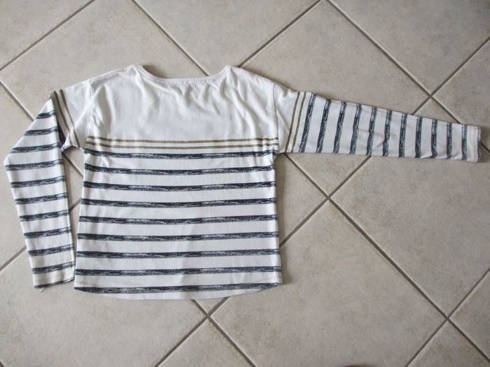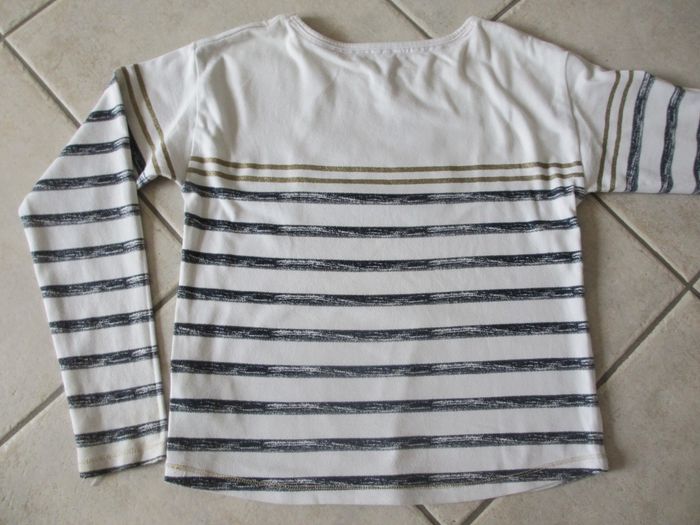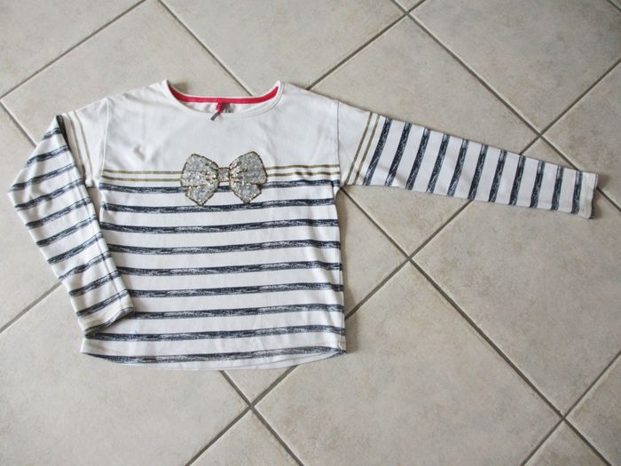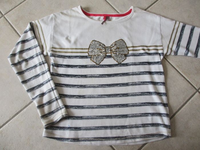 T-shirt manches longues fille Orchestra - 10 ans Fond blanc avec rayures bleues et dorées. Motif flot en sequins. Bon état (quelques petites taches : voir photo).