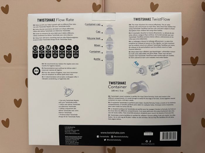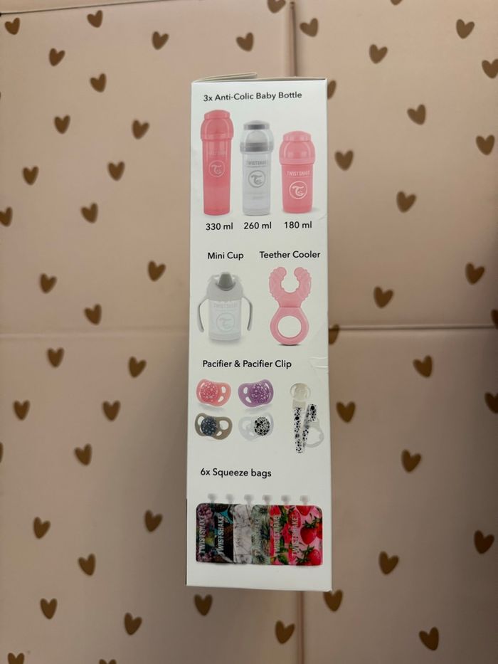 coffret nutrition les essentiels des la naissance - 1 x Twistshake Biberon Anti-Colique S 180 ml 0 Mois et + - 1 x Twistshake Biberon Anti-Colique M 260 ml 2 Mois et + - 1 x Twistshake Biberon Anti-Colique L 330 ml 4 Mois et + - 1 x Twistshake Sucette Orthodontique Lot de 2 0-6 Mois - 1 x Twistshake Sucette Orthodontique Lot de 2 6 Mois et + - 1 x Twistshake Attache-Sucette 0 Mois et + - 1 x Twistshake Anneau de Dentition Réfrigérant 2 Mois et + - 1 x Twistshake Mini Cup Tasse d'Apprentissage 230 ml 4 Mois et + - Twistshake Gourde Réutilisable Motif Fruits Lot de 5 x 220 ml valeur neuve 55€