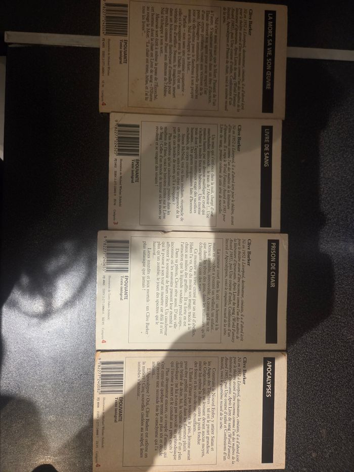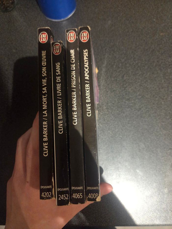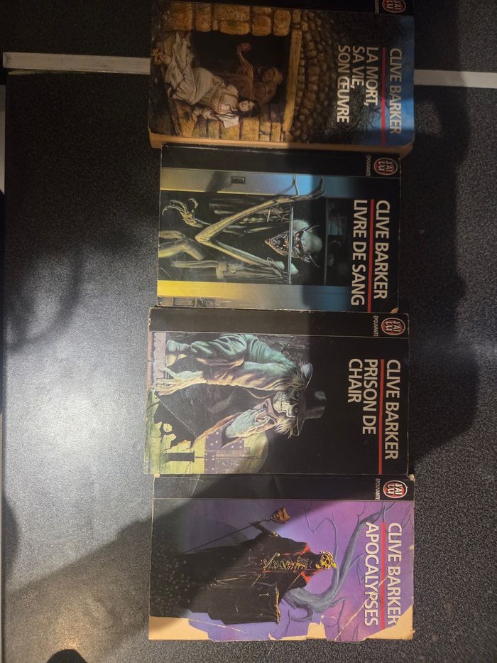 Lot de livre clive baker la vie et la mort apocalypse livre de sang prison de chair Bon etat Des defauts c'est des livres qui ont vecus Prix negociable Remise en main propre possible