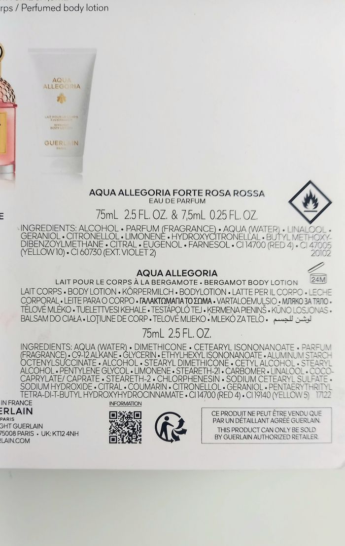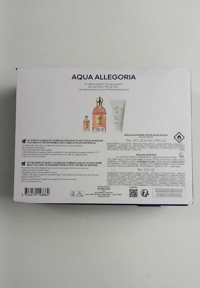 Coffret qui comprend : - une eau de parfum Aqua Allegoria forte Rosa Rossa de 75mL. - une eau de parfum Aqua Allegoria forte Rosa Rossa de 7,5ml (idéal pour le voyage) - un lait parfumé pour le corps à la bergamote.