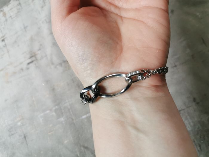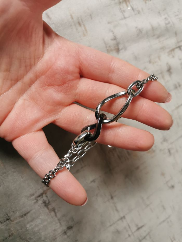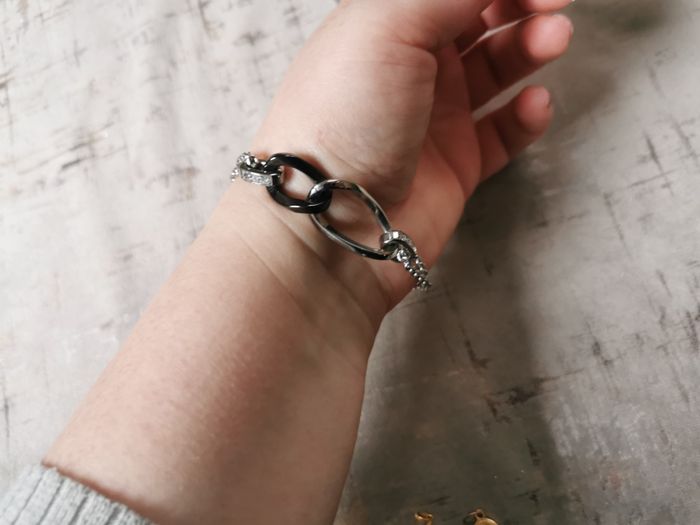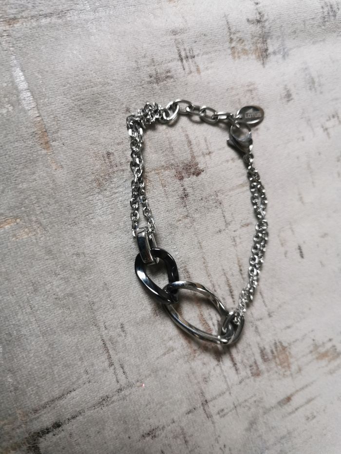 Bracelet chaîne et strass Lotus Style. Bracelet chaîne et 4 gros maillons dont 2 à strass, en acier inoxydable de haute qualité et résistance, en très bon état, dans les couleurs argentée et noir, belle qualité. Dimensions : Longueur : 20,5 cm Poids : 15g.