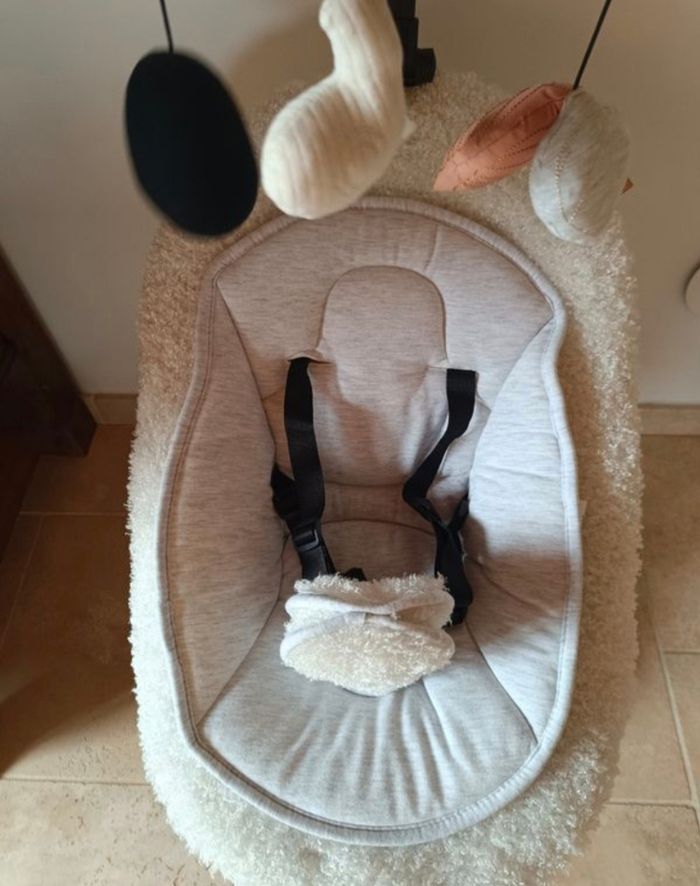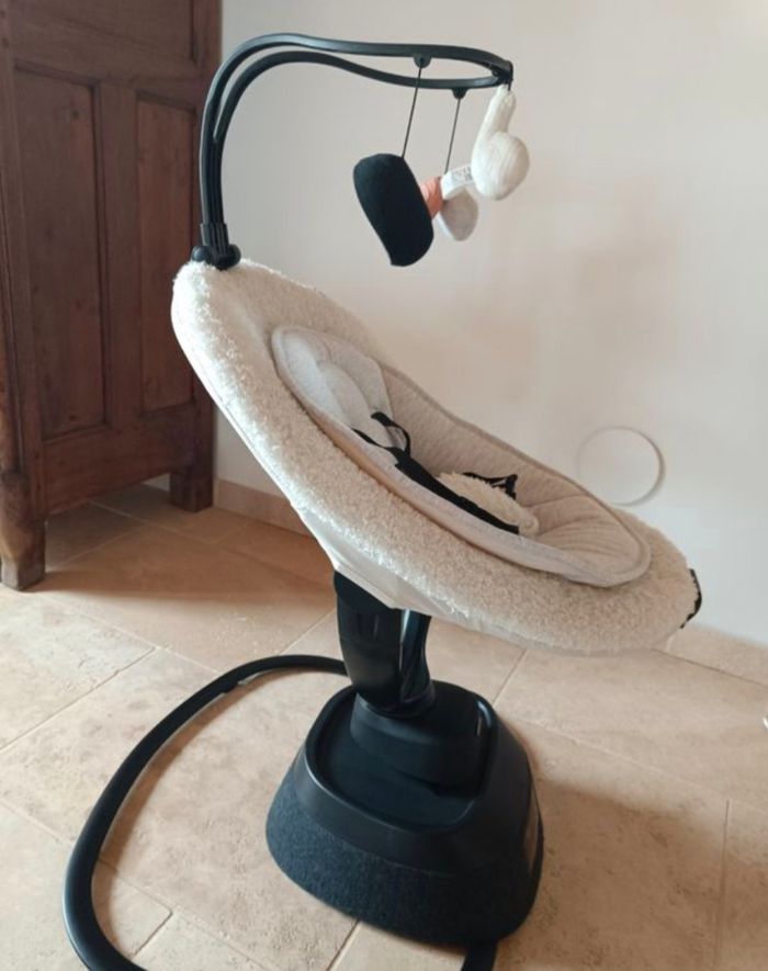 Balancement : 8 mouvements différents ultra fluides pour bercer bébé selon ses préférences Tissu en bouclette tout doux, réducteur en jersey d'un côté et velours côtelé de l'autre, dans des tons clairs et harmonieux, pour s'intégrer à la décoration de votre salon Gestion à distance avec sa télécommande pour régler le bercement, la vitesse, le minuteur et le son (12 berceuses) Système de rotation de l'assise à 360° Déhoussable pour faciliter le nettoyage