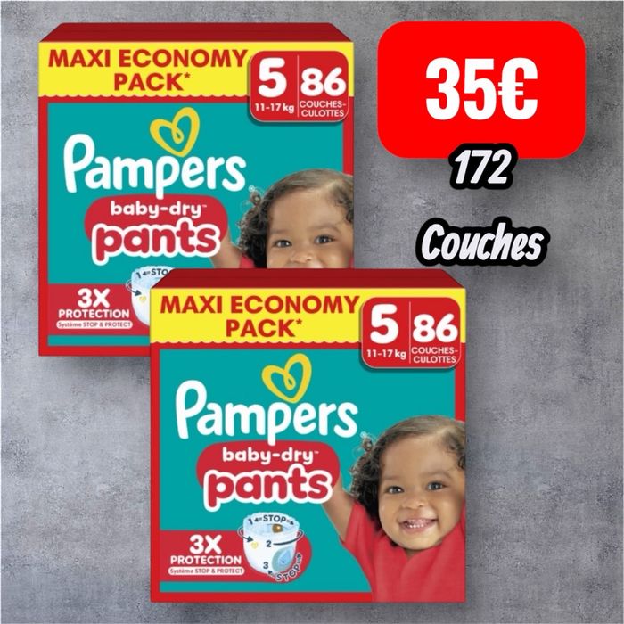 Couches Pampers baby dry pants maxi Economy pack taille 5 11/17kg 172 couches Couches Pampers baby dry pants maxi Economy pack taille 5 11/17kg 86 couches x2 soit 172 couches au total 35€ prix ferme ! Premier arrivé premier servi Envoi rapide et soigné