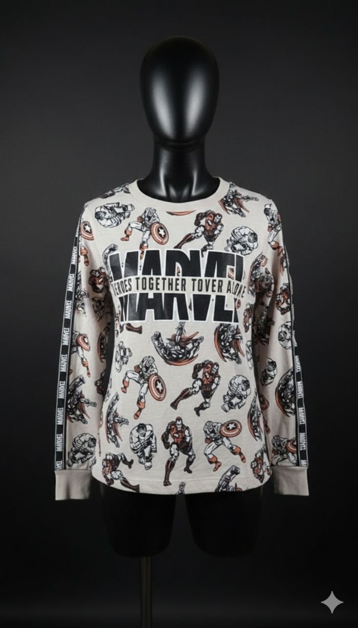 Plongez dans l'univers épique des Avengers avec ce superbe t-shirt à manches longues de la marque officielle Marvel. Il arbore un motif intégral et vintage mettant en scène les emblématiques super-héros Marvel : Captain America, Iron Man, Thor, et Hulk. Le design reprend l'esthétique classique des comics, avec des touches de couleur orange vif sur fond écru/beige clair, soulignant la nostalgie des premières aventures. 3 / 4 ans neuf