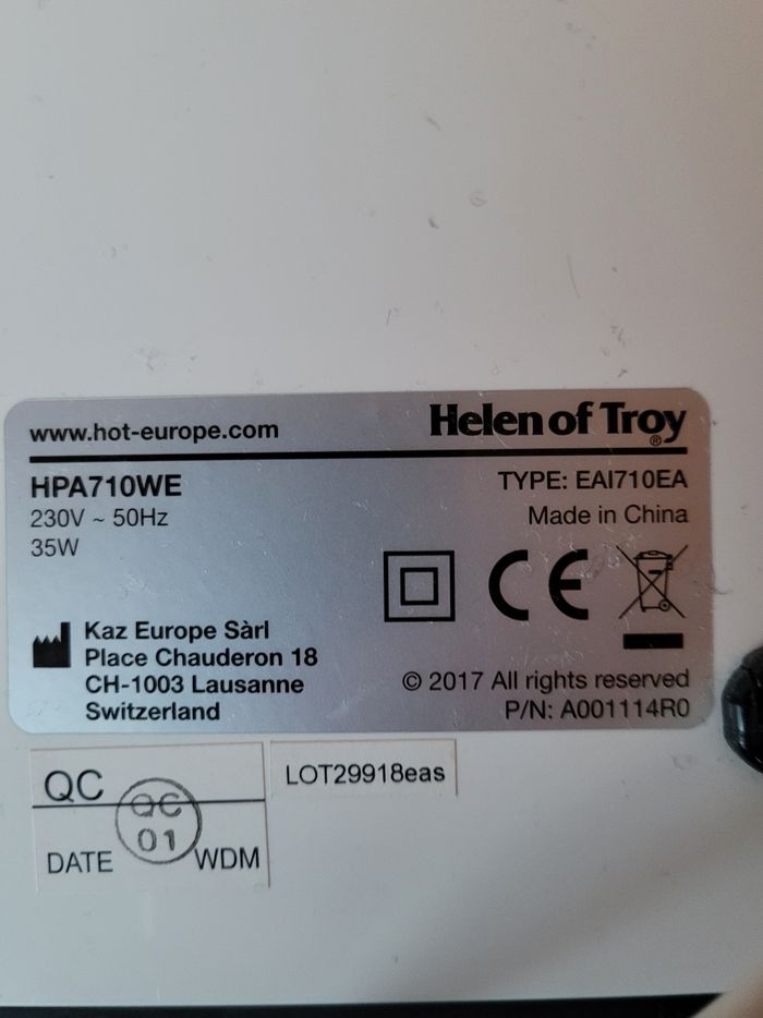 Je vends un purificateur d'air Honeywell HPA710W en bon état, automatique, très silencieux et efficace. Il a été utiliser pendant environ 6 mois (durée du filtre 12 mois). Je le vends car j'ai acheté un model plus petit. Poids 6.1 kg. Dimensions 48x32x21cm.