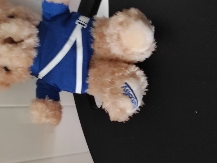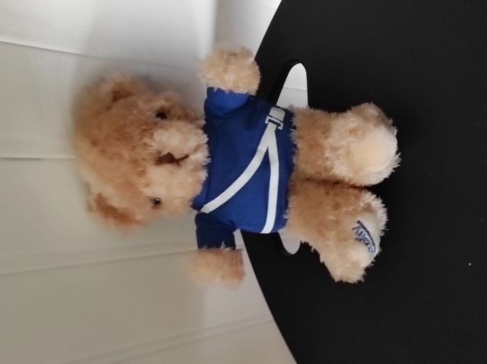 "Adorable peluche ours toute douce, idéale pour un cadeau 🧸 Détails : ours avec t-shirt bleu Coloris : marron et bleu Peluche publicitaire État : Neuf sans étiquette, jamais utilisé Texture douce et agréable Parfaite pour un enfant"