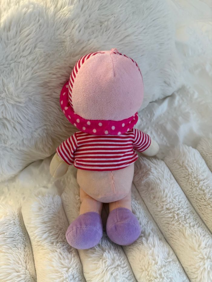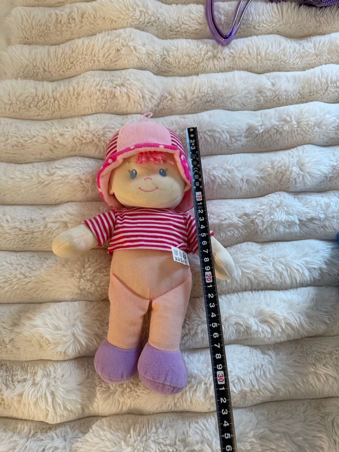 Poupée Chiffon / Doudou à tête rose et marinière rouge et blanc ❤️ Adorable petite poupée en tissu, type poupée de chiffon ou doudou, parfaite pour les jeunes enfants. Elle porte un T-shirt style marinière à rayures rouges et blanches, un pantalon couleur peau et des pieds violets. Sa tête est recouverte d'un chapeau rose à rayures et à pois blancs, qui lui donne un air joyeux. Elle est douce et légère, idéale pour les câlins et facile à manipuler. 🧸 Détails : • Type : Poupée de chiffon / Doudou • Tenue : Marinière rouge et blanc, chapeau rose. • Couleurs : Rose, rouge, blanc, violet • Taille approximative : Environ 23 cm de hauteur • État : Très bon état général. poupee chiffon doudou bebe poupeeentissu jouetenfant mariniere rouge rose violet