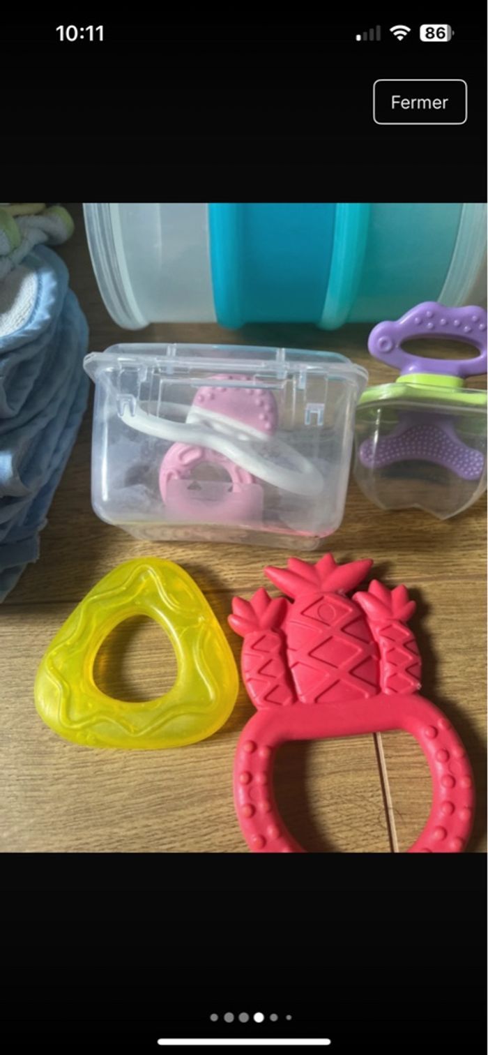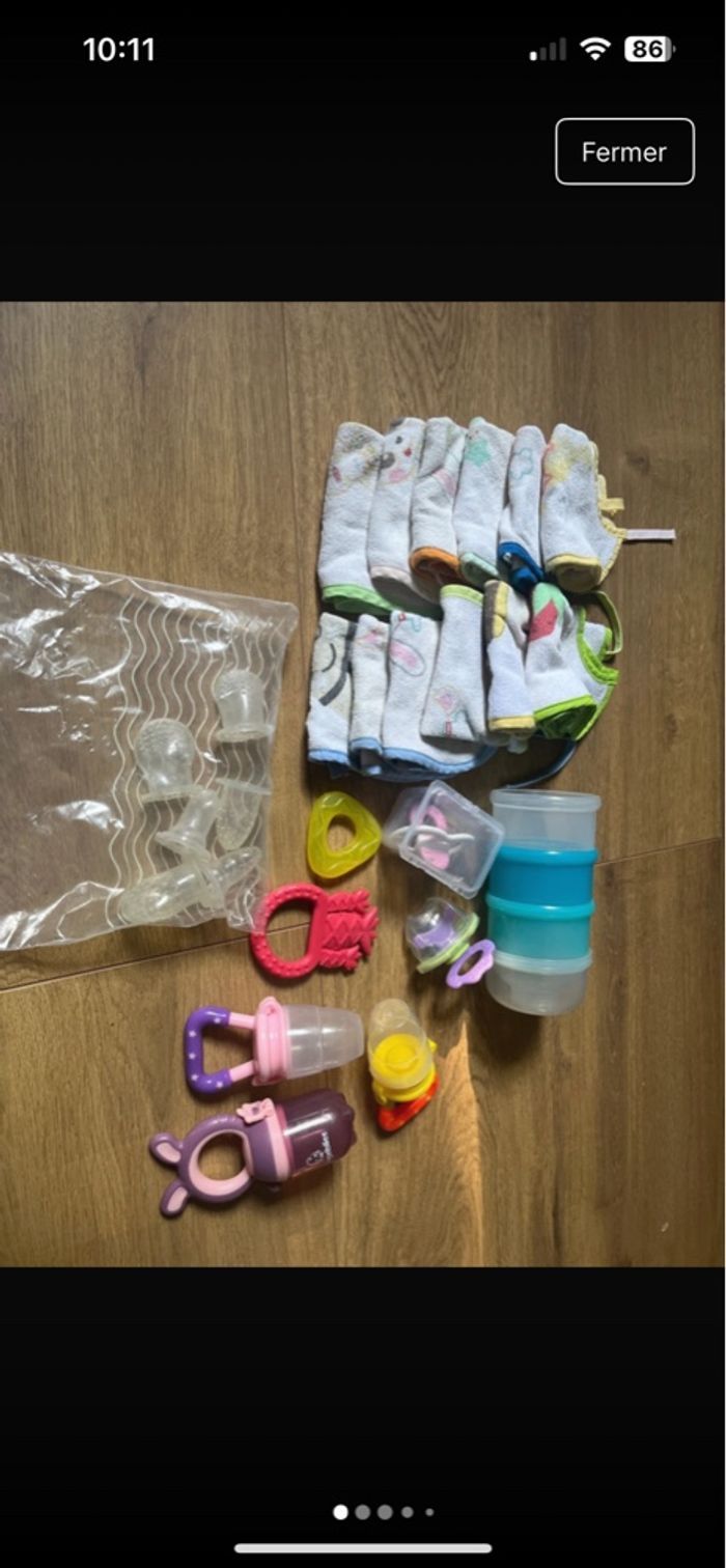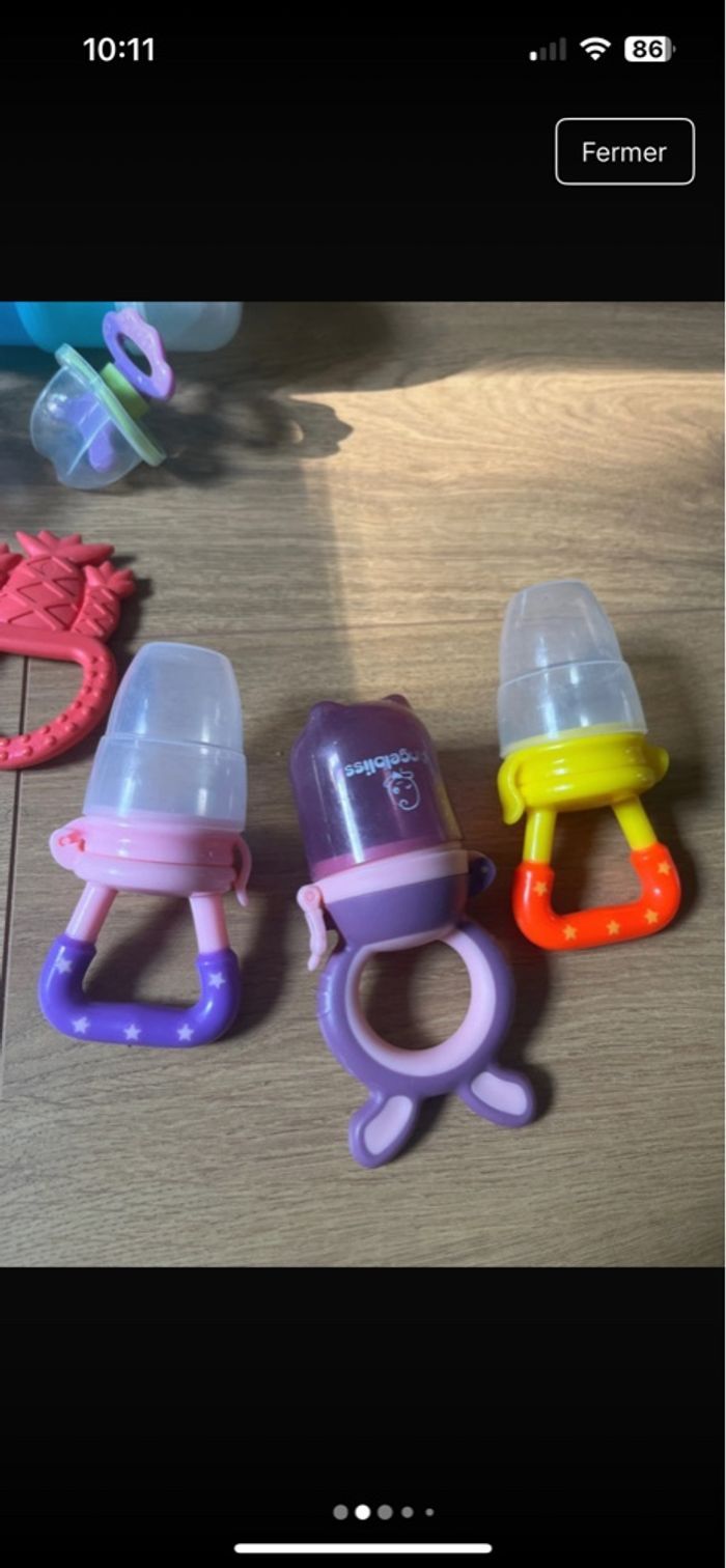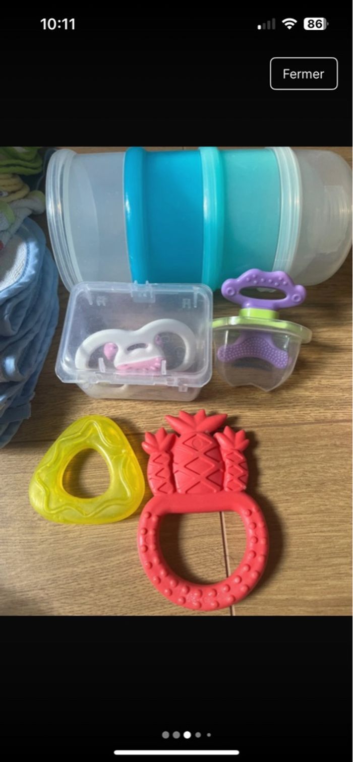 Vend ensemble pour bébé Un doseur de lait 12 bavoirs certains ont quelque taches 3 sucettes pour diversification alimentaire idéale aussi pour mettre des fruit congelés quand les enfants on mal aux dents fournis également les tétines avec trous mais vous pouvez en acheter des neuves en pharmacie ou sur amazon Deux dentier à mâcher celui avec la boîte peu être stérilisée au micro onde