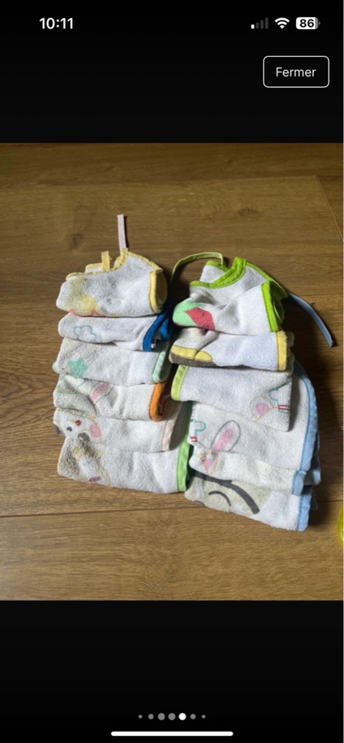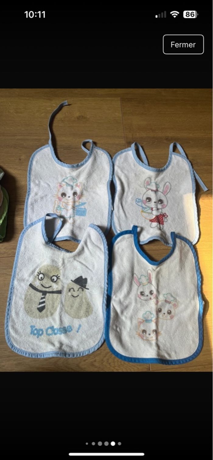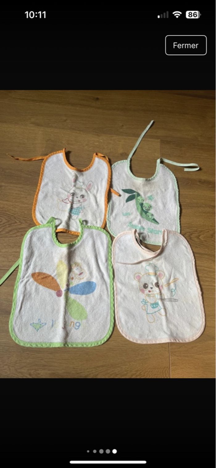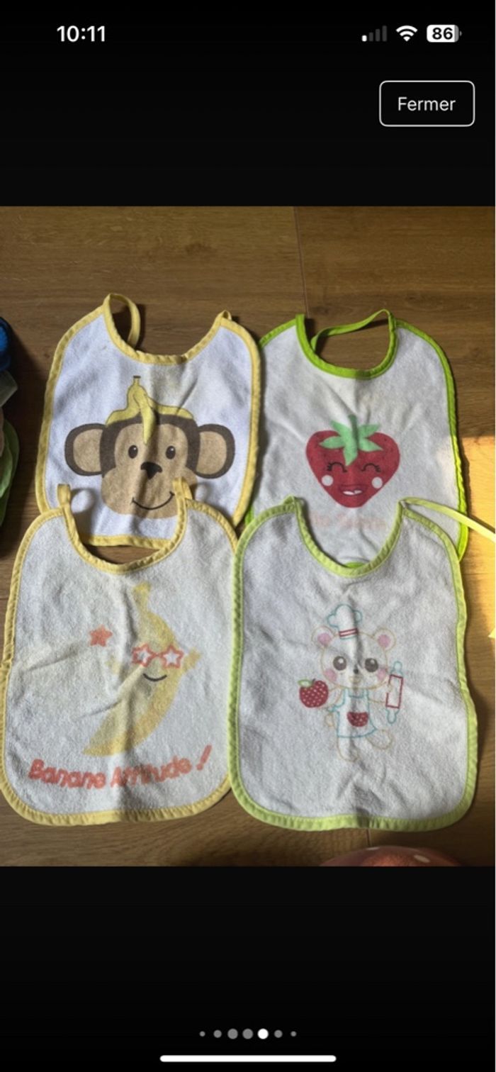 Vend ensemble pour bébé Un doseur de lait 12 bavoirs certains ont quelque taches 3 sucettes pour diversification alimentaire idéale aussi pour mettre des fruit congelés quand les enfants on mal aux dents fournis également les tétines avec trous mais vous pouvez en acheter des neuves en pharmacie ou sur amazon Deux dentier à mâcher celui avec la boîte peu être stérilisée au micro onde