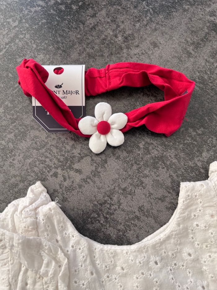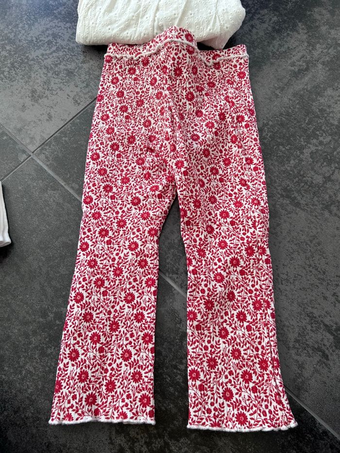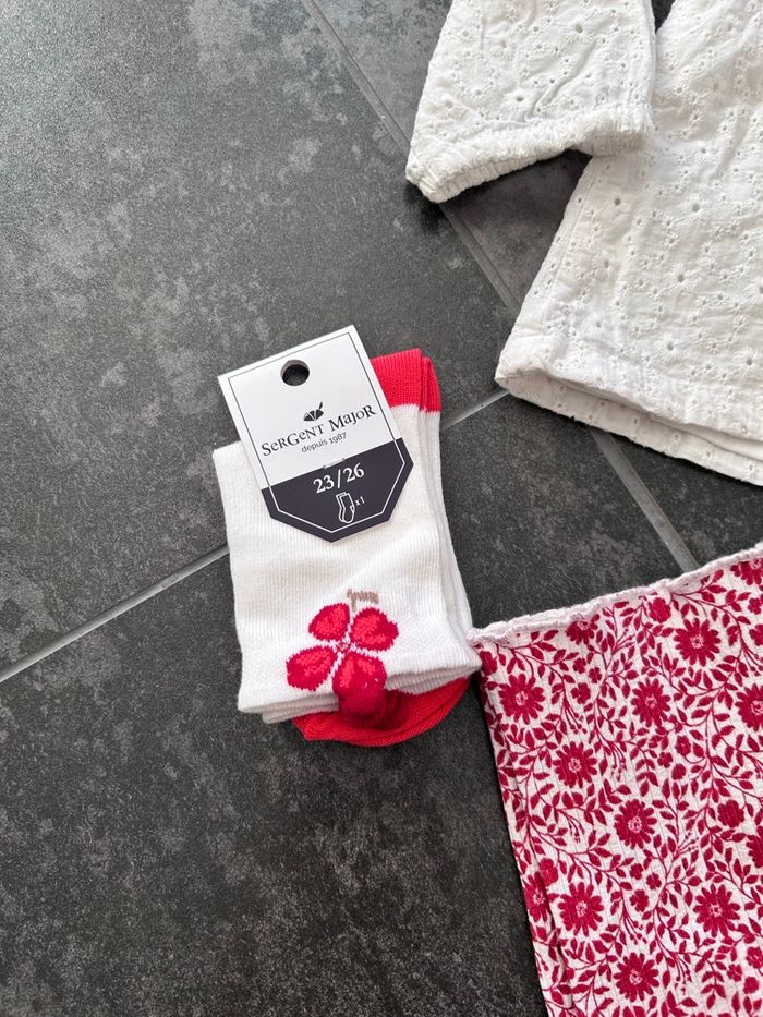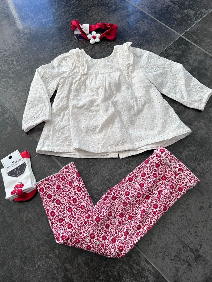 Legging 36mois en très bon état mais légère usure au genoux et un peu tâché aux genoux(voir photo) Blouse 36mois en parfait état +bandeau neuf et chaussette neuve