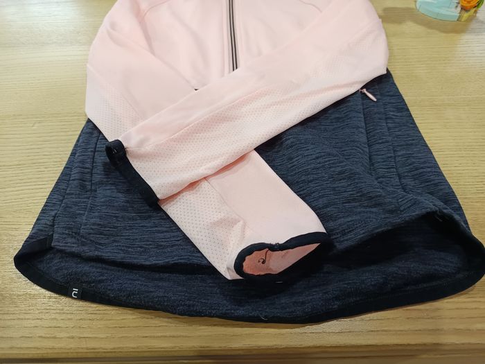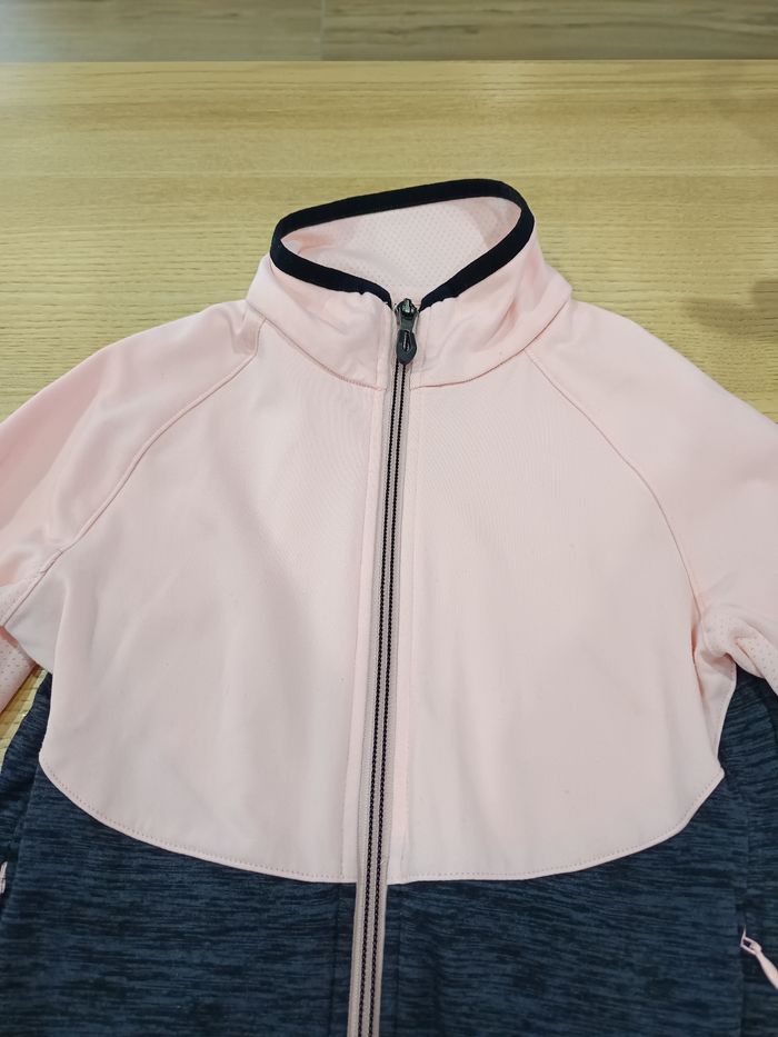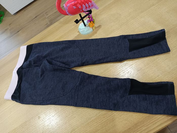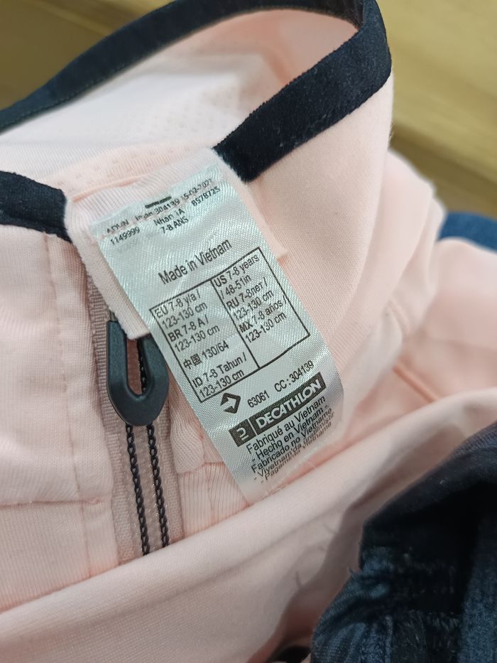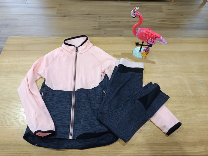 Tenue de sport Decathlon taille 7/8ans 123/130cm Pas d'étiquette sur le bas , longueur du bas 61cm (les deux étaient ceci dit fixés ensemble en magasin). Globalement en très bon état, légères peluches.