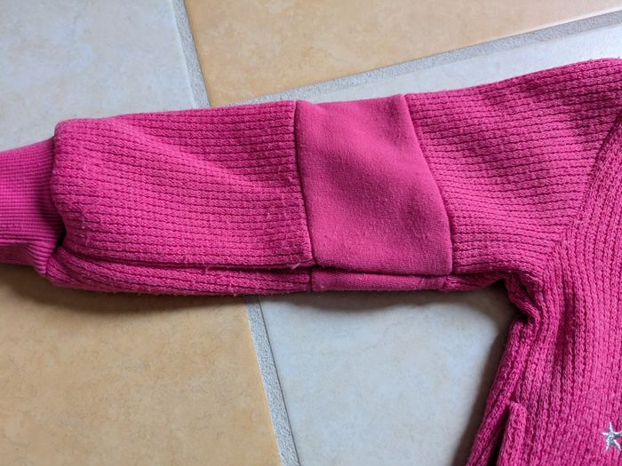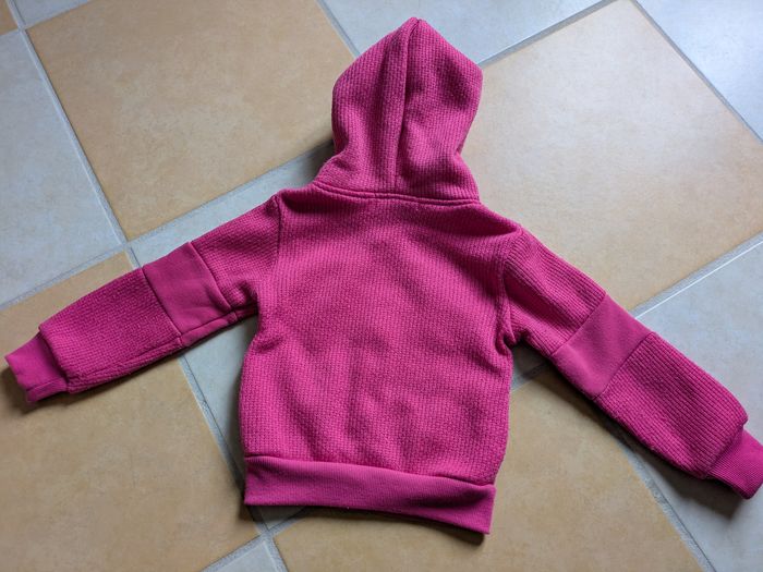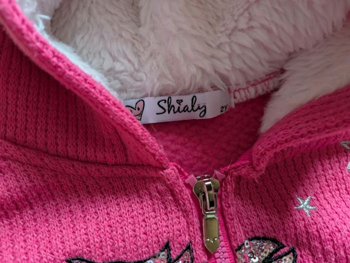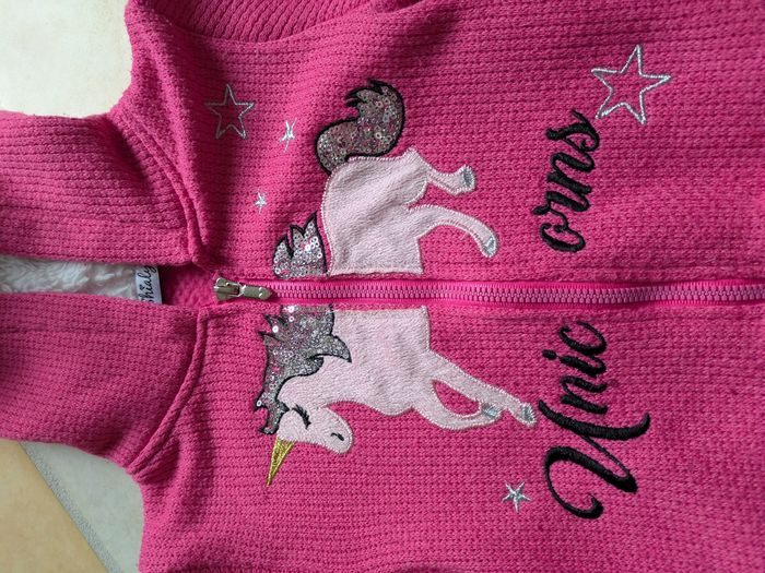 Gilet chaud rose licorne avec capuche Taille 2 ans Marque shialy Un peu de bouloches et une trace peu visible sur la manche. Voir photos.